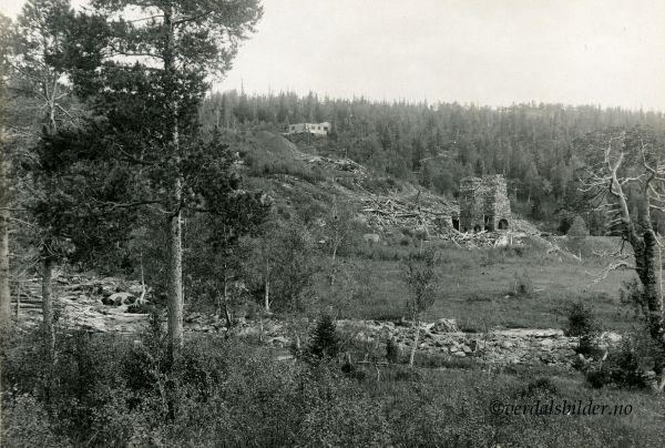 Bildet er tatt fra kontorbrakka mot de to smelteovnene. I dag står bare den ene av ovnene igjen. Huset ovenfor er vel brakka for karene som arbeidet i gruva. <br>Arbeidsmannsbrakka er borte, bare steinmurene er synlig, og det samme er kontorbrakka. Bildet er tatt av Gunnar Holmsen. NGU-foto