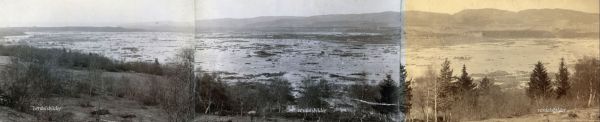 Sammensatte bilder som viser mye av de overflødde områder. Bilde til vestre er det som i dag er Nessleira. Nr 2 mot Haga og Hegstad, og det siste innover Raset. Fotograf, Hans Henrik Reusch. NGU-bilde.