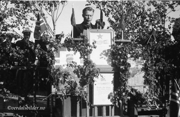 Arrangementet foregikk på skoleplassen ca der Helsesenteret står i dag. Ser en nærmere etter er det bilde av både kong Håkon og Josef Stalin på talerstolen. Bilde etter Olga Anderson.