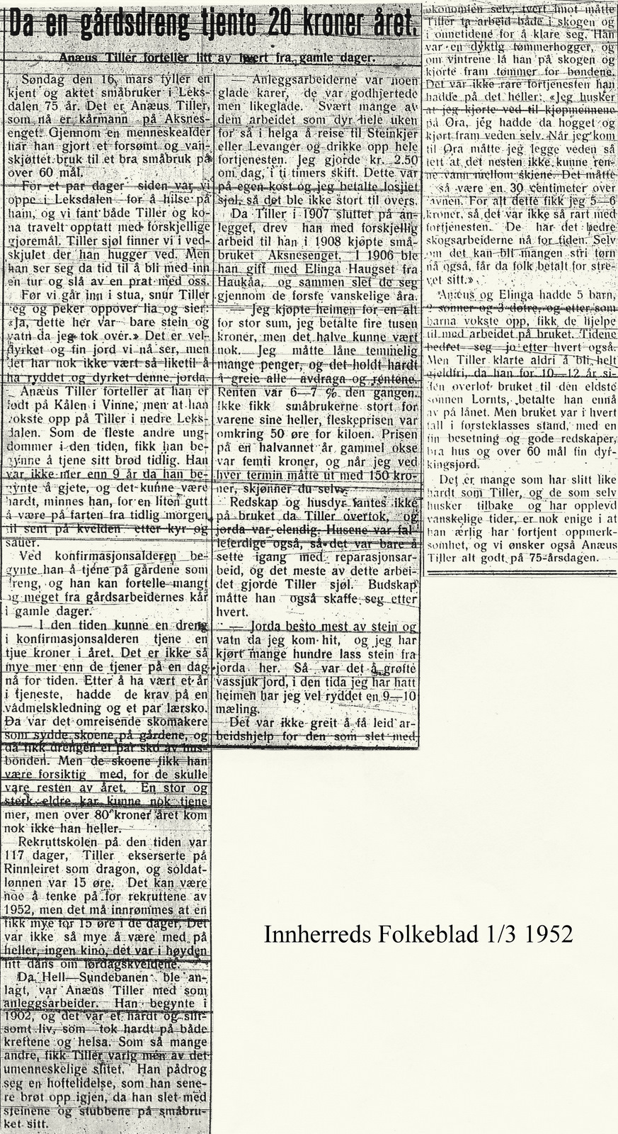 1952 Avisutklipp Da en gårdsdreng tjene 20 kr i året