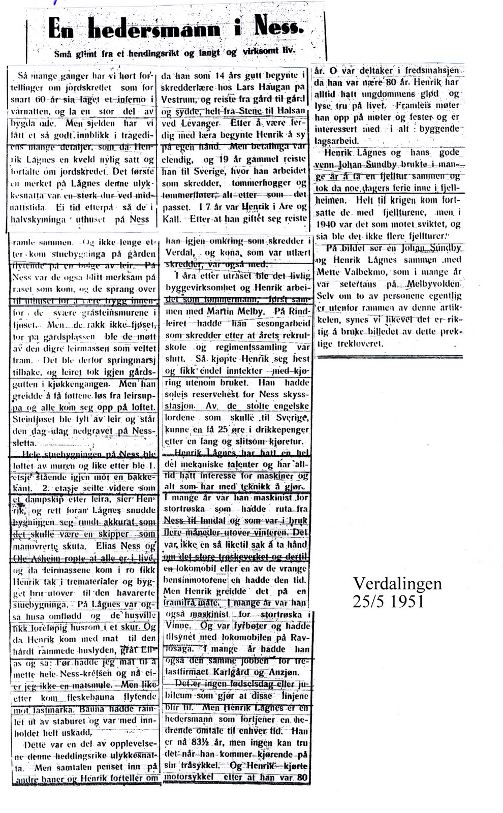 1951 Avisutklipp En hedersmann fra Ness