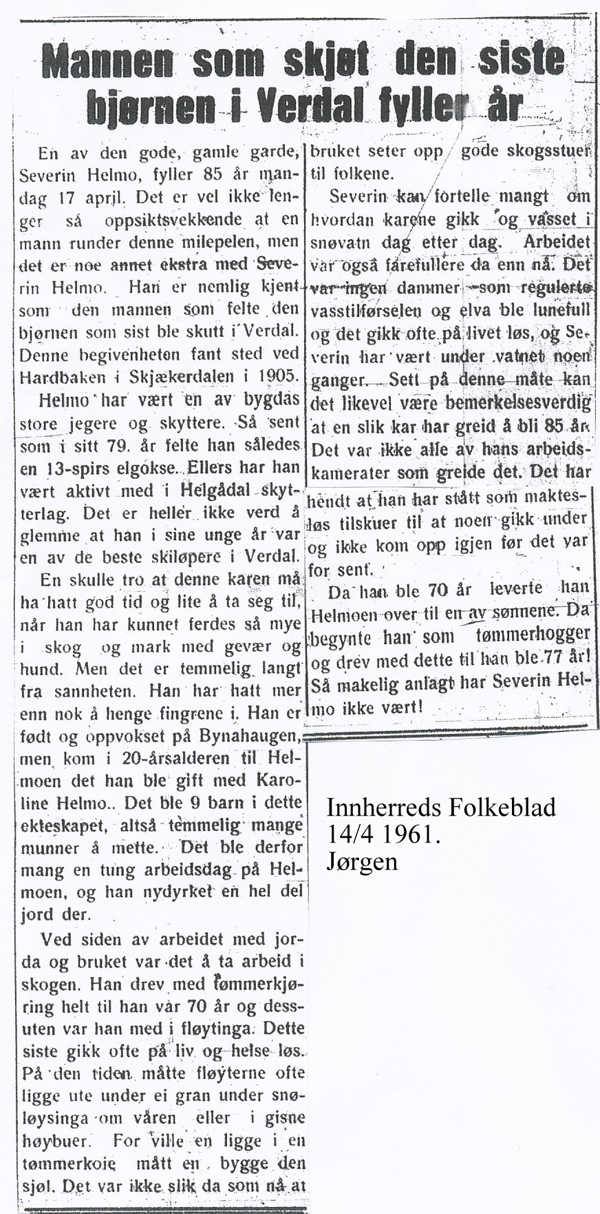 1961 Avisutklipp Mannen som skjøt den siste bjørnen i Verdal fyller år