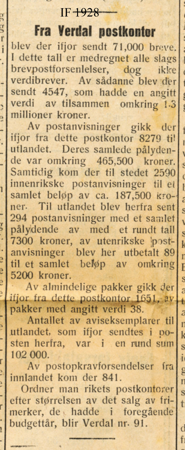 1928 Avisutklipp Statistikk fra Verdal Postkontor