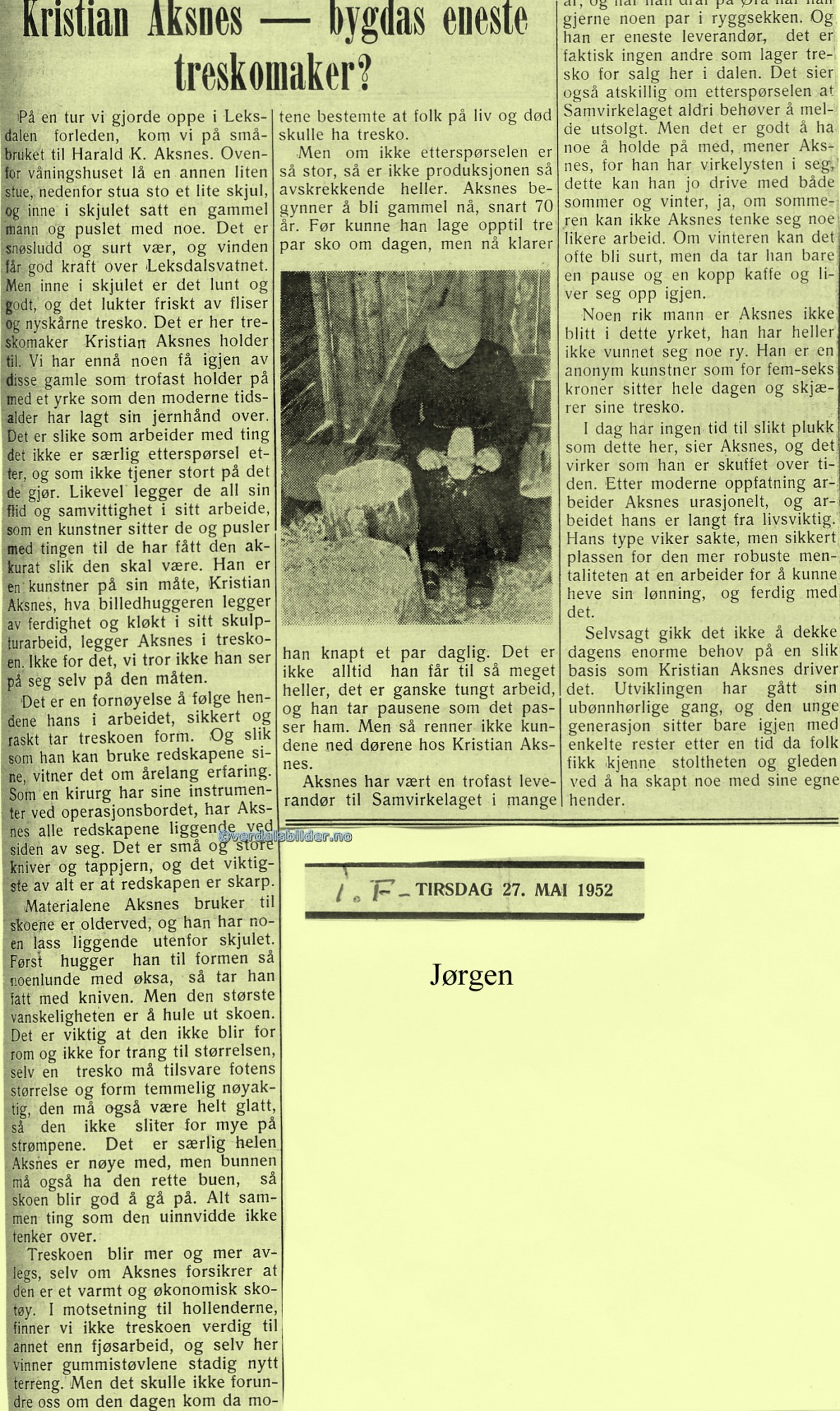 1952 Avisutklipp Kristian Aksnes - bygdas eneste treskomaker?