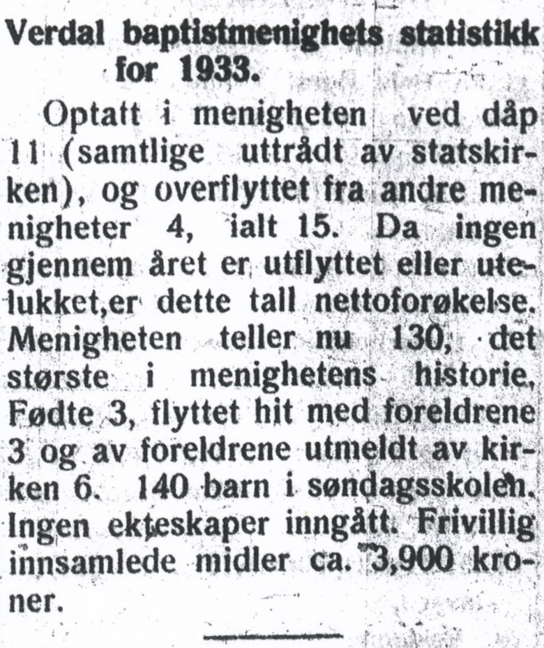 Avisutklipp Verdal Babtistmenighets statistikk for 1933