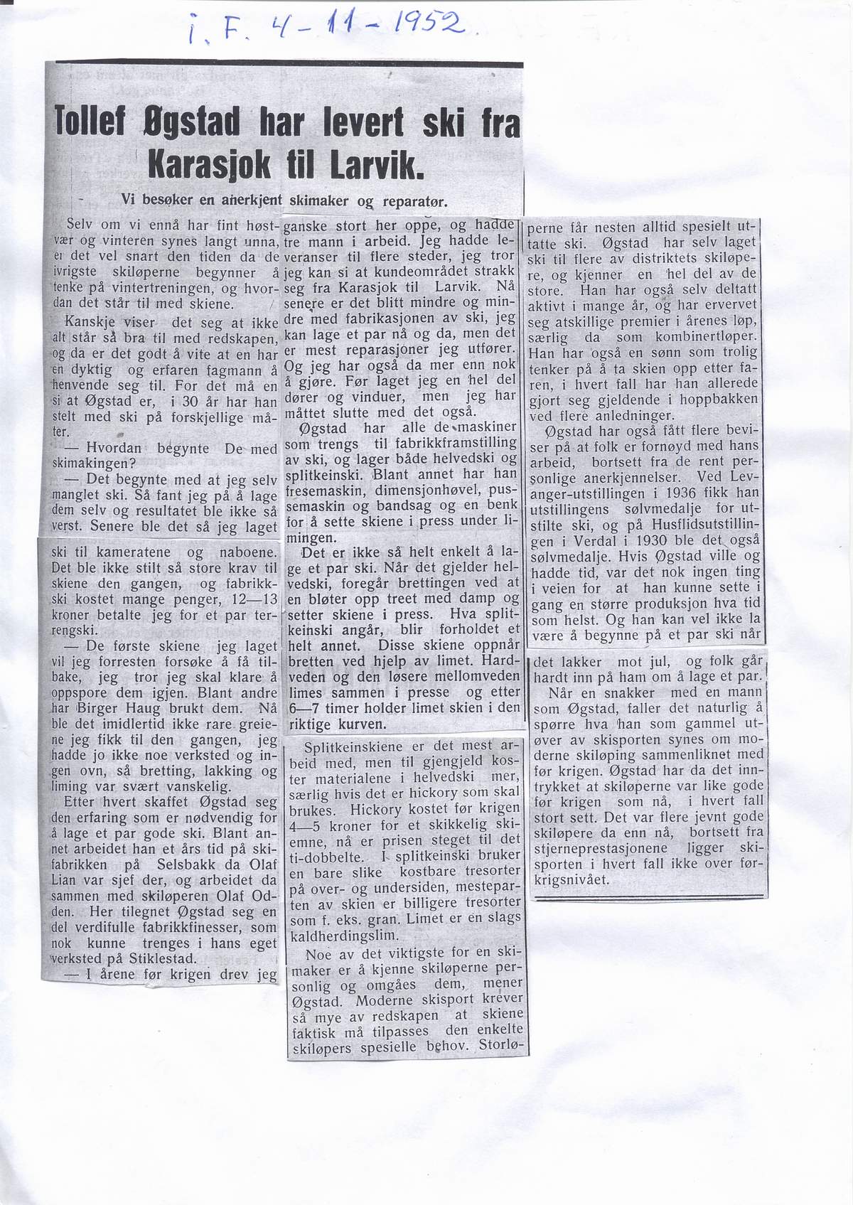 1952 Avisutklipp Tollef Øgstad har levert ski fra Karasjok til Larvik