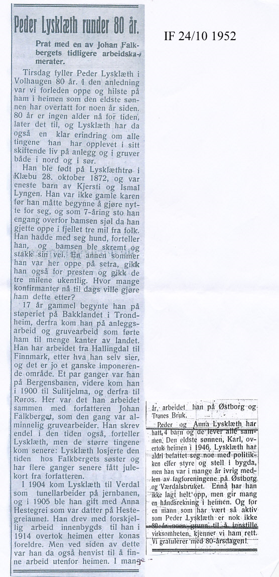 1952 Avisutklipp Peder Lysklæth runder 80 år