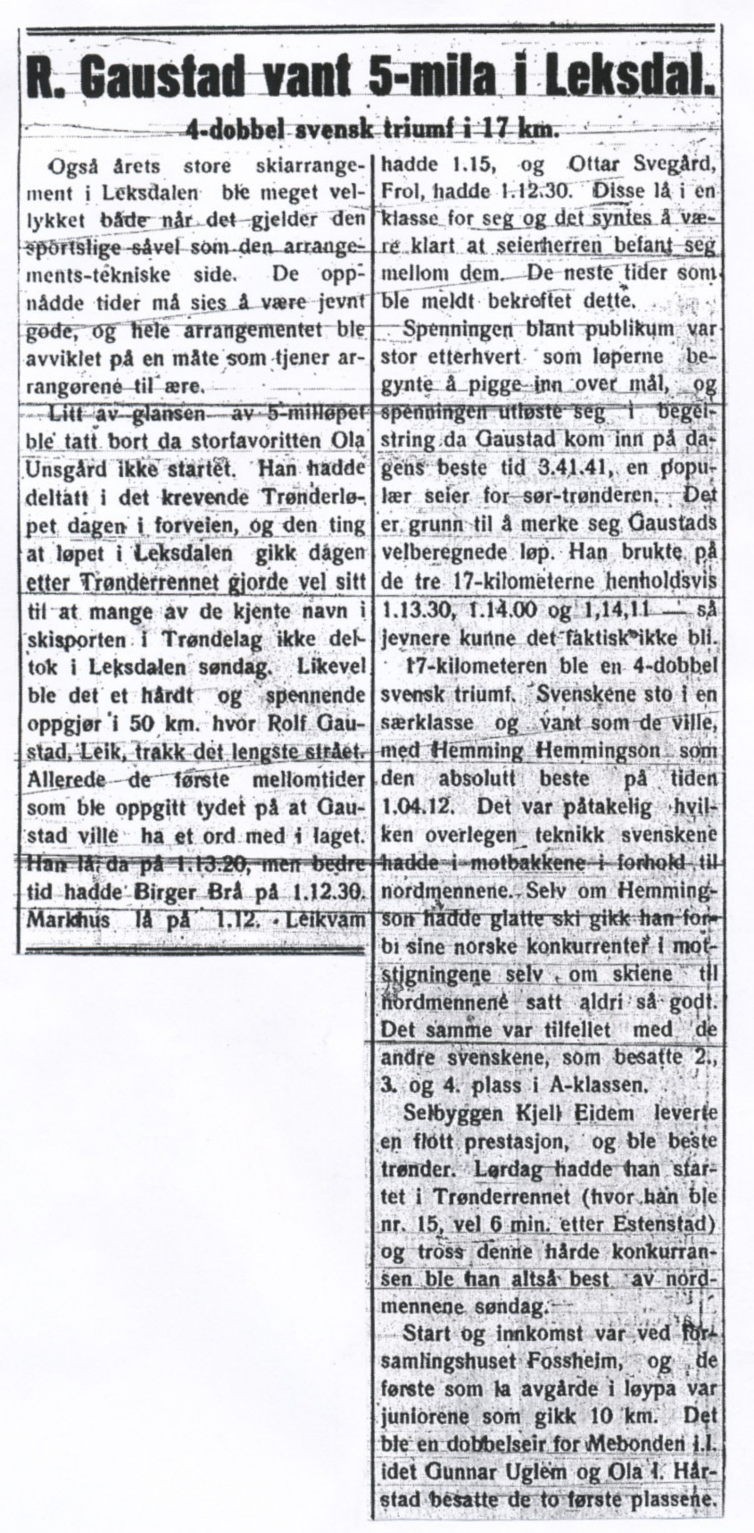 1934 Avisutklipp Rolf Gaustad Leik vant 5-mila i Leksdal