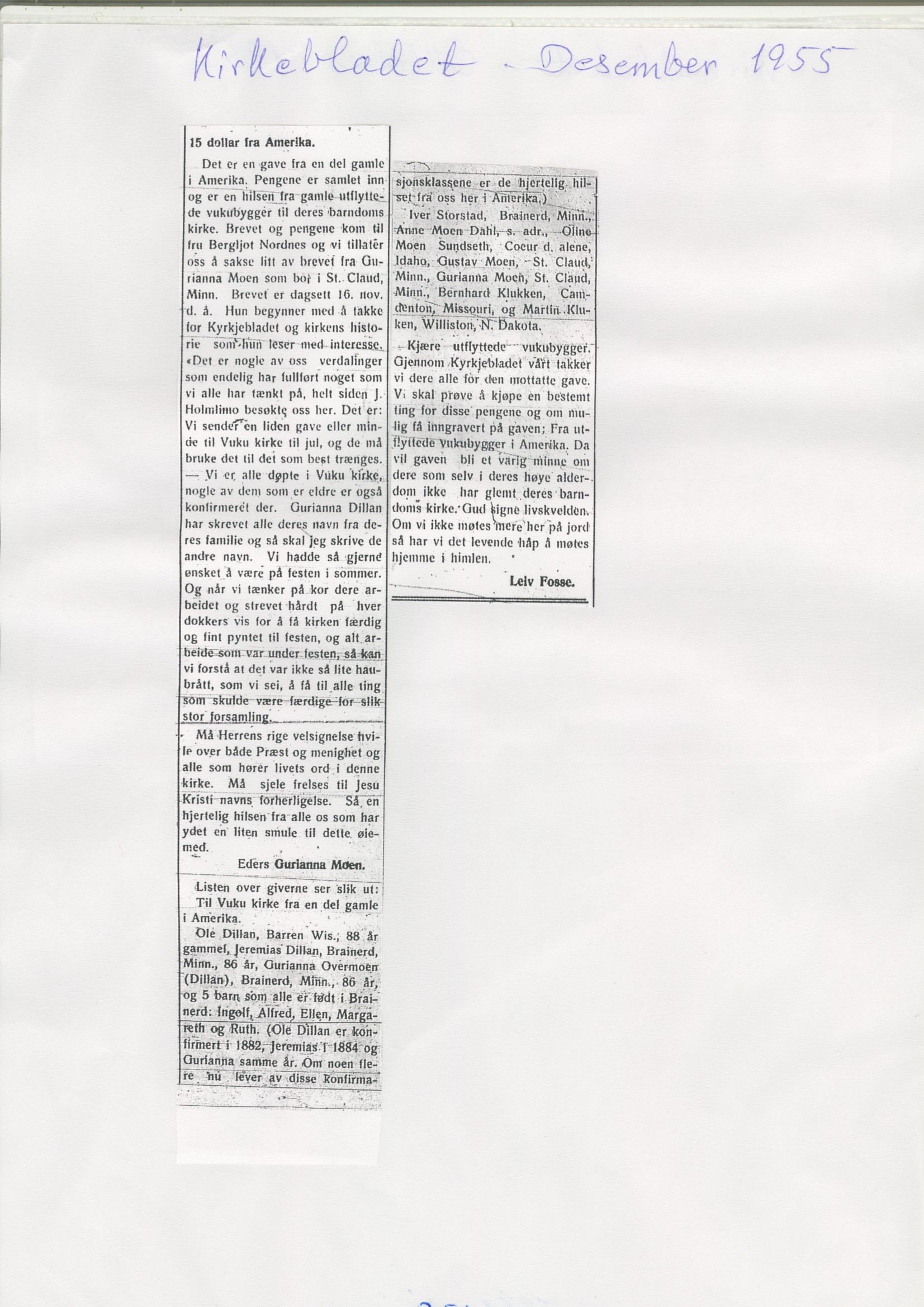 1955 Avisutklipp Gave til Vuku kirke fra utflytta vukusbygg.