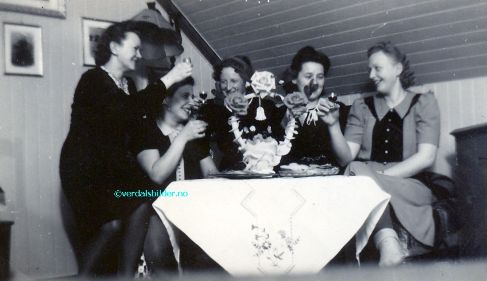 Blide damer feirer med en liten snaps omkring år 1946 . -- Utlånt av Asbjørn Dahling Har du korrigeringer, nye navn eller en kommentar? Ring eller send sms til 472 97 311 eller 456 00 950 Det beste er å sende en E-post til: post@verdalsbilder.no Tips noen om dette bildet : Klikk her Forstørre bildet Bruk ctrl-knapp + musehjul oppover for å forstørre bildet. Bruk ctrl-knapp + musehjul nedover for å forminske bildet Du kan også bruke "ctrl-knapp" samtidig med "+" og "-" på det numeriske tastaturet. "Ctrl" og "*" (eller null) tilbakestiller størrelsen | ||||