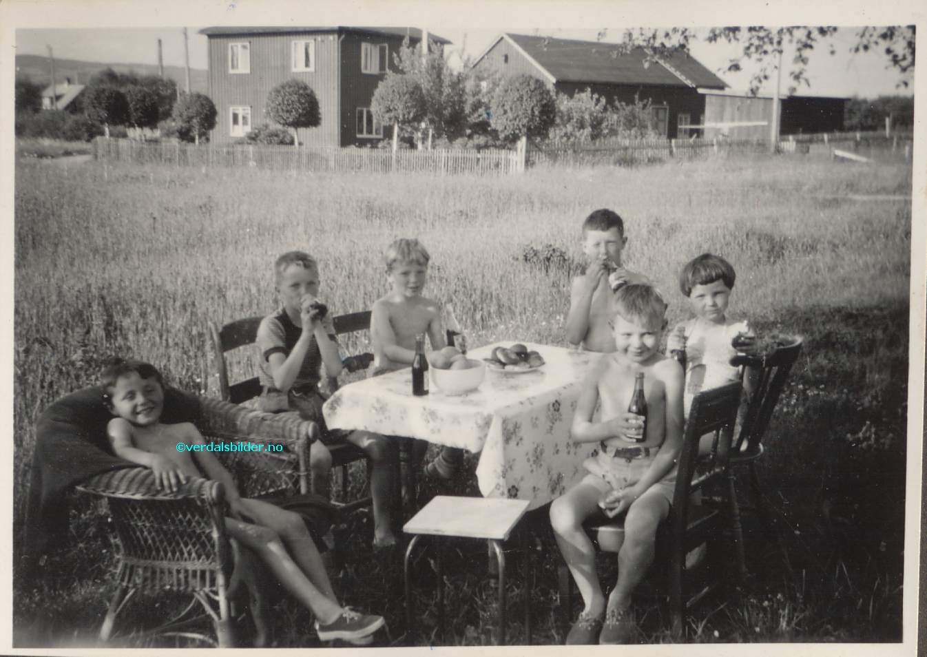 Fødselsdagsselskap på Tinna sommeren 1955 -- Det er Joar Sveberg fra Fredrikstad som fyller 11 år. Det ser ut til at alle storkoser seg med rødbrusen. I bakgrunnen ser vi huset til Laura og Andreas By. Skulle vi ha plassert dette bordet på samme plass i dag så måtte det ha svevd 5 m over gulstripa på nyveien gjennom Øra, 20 m vest for Emmabrua. Har du korrigeringer, nye navn eller en kommentar? Ring eller send sms til 472 97 311 eller 456 00 950 Det beste er å sende en E-post til: post@verdalsbilder.no Tips noen om dette bildet : Klikk her Forstørre bildet Bruk ctrl-knapp + musehjul oppover for å forstørre bildet. Bruk ctrl-knapp + musehjul nedover for å forminske bildet Du kan også bruke "ctrl-knapp" samtidig med "+" og "-" på det numeriske tastaturet. "Ctrl" og "*" (eller null) tilbakestiller størrelsen | ||||