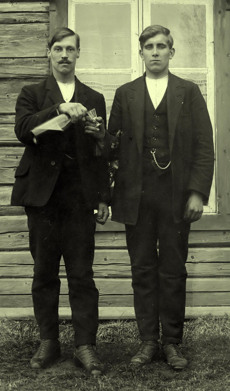 | Skjenking av en dram omkring år 1918. Olaf Årstadvold døde i år . Se flere navnsatte bilder Før markør opp til haka på personene for å få opp navn |