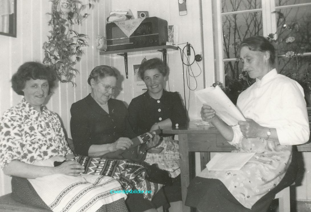 | Fire damer fra Volhaugen diskuterer håndarbeid omkring 1950