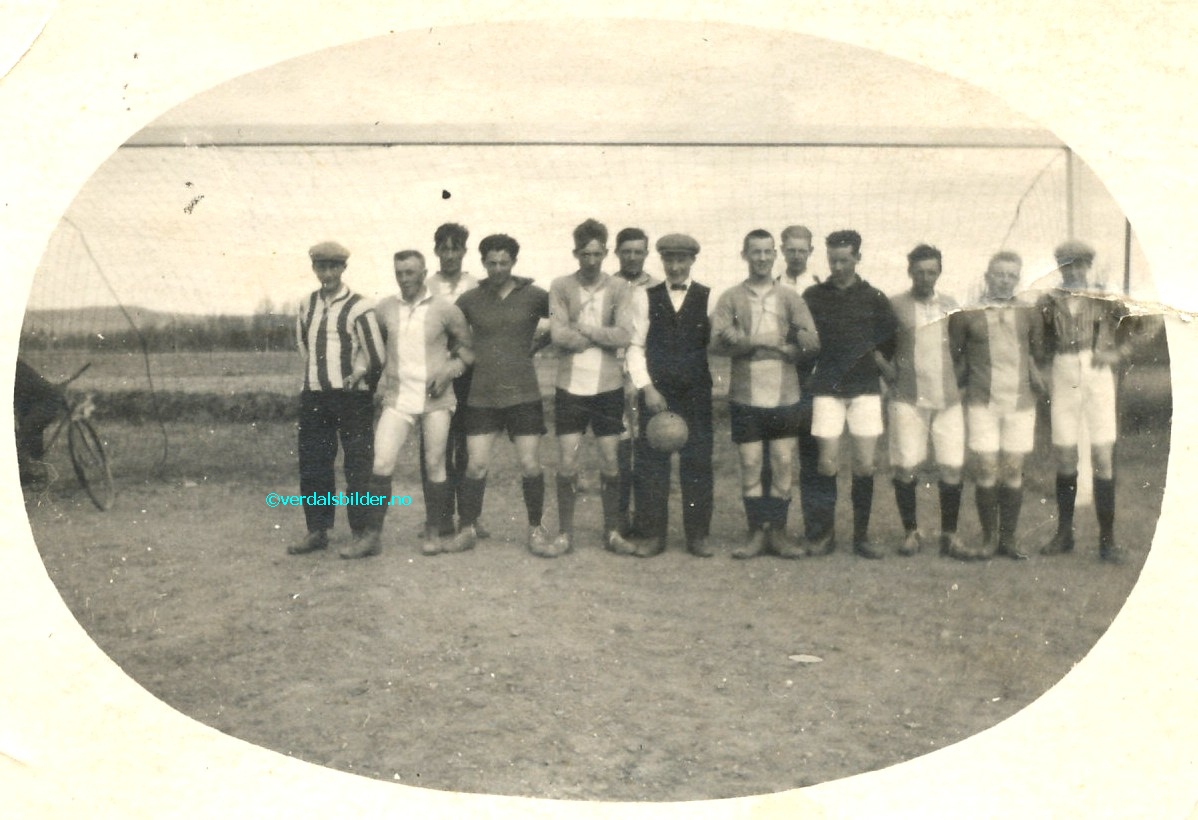 Fotballag fra Verdal omkring1930. -- Utlånt av Aase Guldbrandsen Kristoffersen. Navna sto skrevet bak på bildet. Hvis noen kjenner mere til de ukjente og fornavna som mangler, ta kontakt på tel 47297311 Har du korrigeringer, nye navn eller en kommentar? Ring eller send sms til 472 97 311 eller 456 00 950 Det beste er å sende en E-post til: post@verdalsbilder.no Tips noen om dette bildet : Klikk her Forstørre bildet Bruk ctrl-knapp + musehjul oppover for å forstørre bildet. Bruk ctrl-knapp + musehjul nedover for å forminske bildet Du kan også bruke "ctrl-knapp" samtidig med "+" og "-" på det numeriske tastaturet. "Ctrl" og "*" (eller null) tilbakestiller størrelsen | ||||