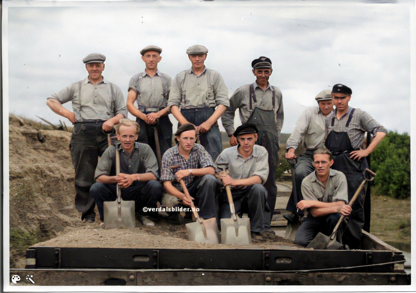 Grustaket på Tinden i 1952 -- Disse 10 karene lesset 20 vogner om dagen. Hver vogn tok 6 m3. Arbeidsdag 7-17 (7-13). Middagspausen var en halvtime. De som bodde på Ørmelen måtte sykle fort! Karene måtte til stadighet få ny skuffel da de fort ble slitt ut. De grov seg ned til grunnvatnet og flyttet skinnegangen en gang i uka. Opplysninger fra Oskar Gjersing (Foran t.v.). Navnsatt og utlånt av Målfrid Haugen. Har du korrigeringer, nye navn eller en kommentar? Ring eller send sms til 472 97 311 eller 456 00 950 Det beste er å sende en E-post til: post@verdalsbilder.no Tips noen om dette bildet : Klikk her Forstørre bildet Bruk ctrl-knapp + musehjul oppover for å forstørre bildet. Bruk ctrl-knapp + musehjul nedover for å forminske bildet Du kan også bruke "ctrl-knapp" samtidig med "+" og "-" på det numeriske tastaturet. "Ctrl" og "*" (eller null) tilbakestiller størrelsen | ||||