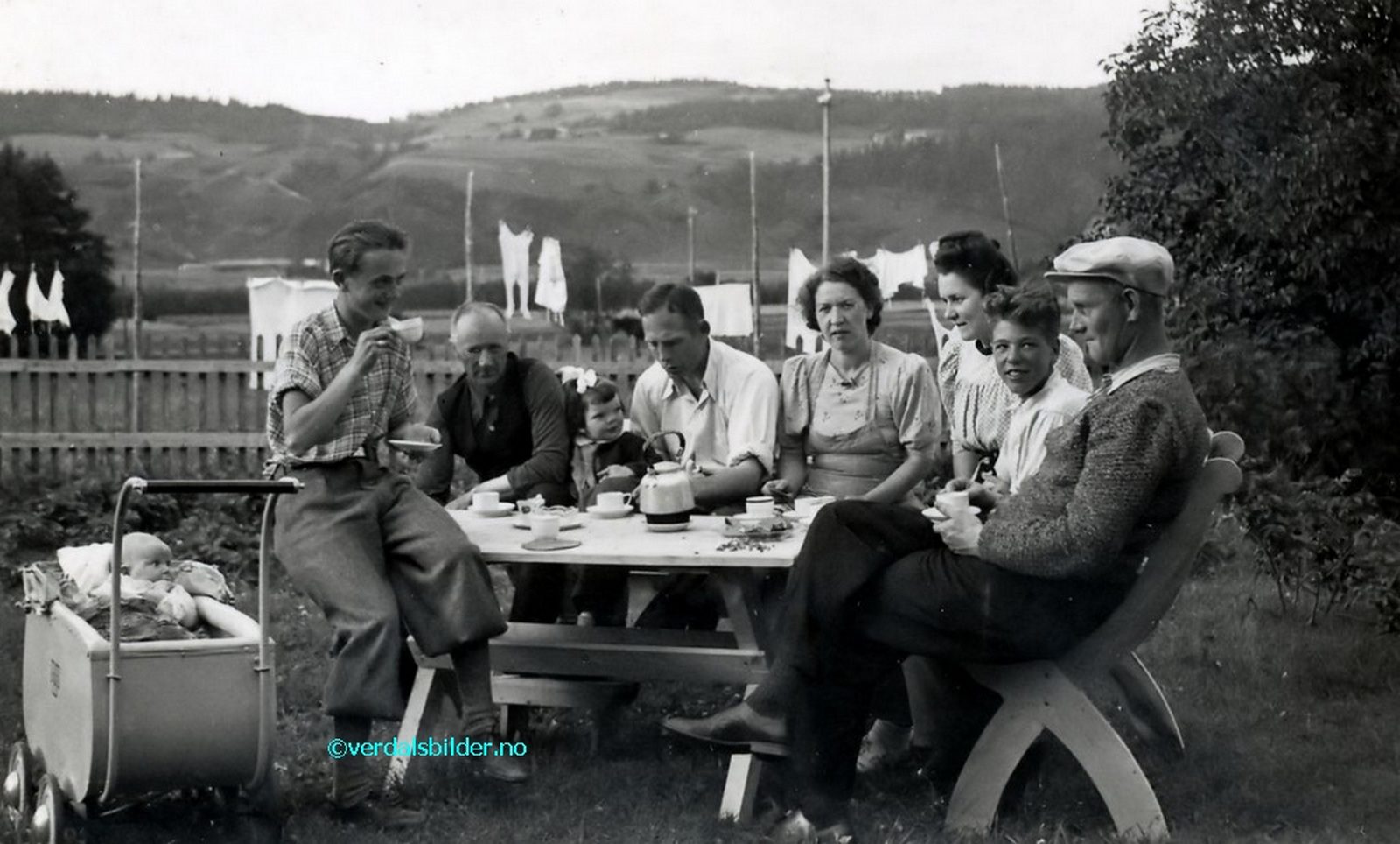 Hageselskap på Kvelstad østre i 1943 -- Som en kuriositet kan nevnes at denne barnevogna ble brukt til illegal transport av en radio under krigen. Utlånt og navnsatt av Alv Okkenhaug. Har du korrigeringer, nye navn eller en kommentar? Ring eller send sms til 472 97 311 eller 456 00 950 Det beste er å sende en E-post til: post@verdalsbilder.no Tips noen om dette bildet : Klikk her Forstørre bildet Bruk ctrl-knapp + musehjul oppover for å forstørre bildet. Bruk ctrl-knapp + musehjul nedover for å forminske bildet Du kan også bruke "ctrl-knapp" samtidig med "+" og "-" på det numeriske tastaturet. "Ctrl" og "*" (eller null) tilbakestiller størrelsen | ||||