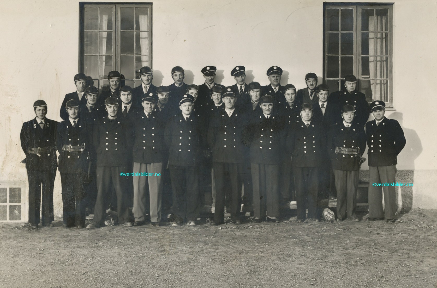 Brannmannskapene fotografert foran Herredshuset i 1949 -- På den tid var brannmannskapene organisert under Verdalsøra Brannkommune. Utlånt av Anne Olise Langnes. Flere har bistått med navn. Har du korrigeringer, nye navn eller en kommentar? Ring eller send sms til 472 97 311 eller 456 00 950 Det beste er å sende en E-post til: post@verdalsbilder.no Tips noen om dette bildet : Klikk her Forstørre bildet Bruk ctrl-knapp + musehjul oppover for å forstørre bildet. Bruk ctrl-knapp + musehjul nedover for å forminske bildet Du kan også bruke "ctrl-knapp" samtidig med "+" og "-" på det numeriske tastaturet. "Ctrl" og "*" (eller null) tilbakestiller størrelsen | ||||