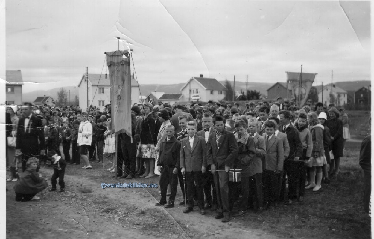 Oppstilling til 17.mai-toget i "Sandhølet" på Ørmelen 1960 . -- Bare de med mest tydelige ansikter er navnsatt. Utlånt og noen navn av Harald Lyng. Einar Storhaug har også bidratt med navn. Har du korrigeringer, nye navn eller en kommentar? Ring eller send sms til 472 97 311 eller 456 00 950 Det beste er å sende en E-post til: post@verdalsbilder.no Tips noen om dette bildet : Klikk her Forstørre bildet Bruk ctrl-knapp + musehjul oppover for å forstørre bildet. Bruk ctrl-knapp + musehjul nedover for å forminske bildet Du kan også bruke "ctrl-knapp" samtidig med "+" og "-" på det numeriske tastaturet. "Ctrl" og "*" (eller null) tilbakestiller størrelsen | ||||