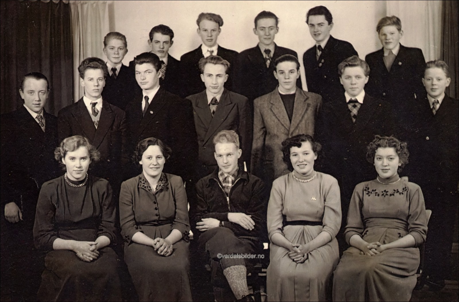Framhaldskolen i Sør-Leksdal i 1954 . -- Utlånt og navnsatt av Halvard Stornes Har du korrigeringer, nye navn eller en kommentar? Ring eller send sms til 472 97 311 eller 456 00 950 Det beste er å sende en E-post til: post@verdalsbilder.no Tips noen om dette bildet : Klikk her Forstørre bildet Bruk ctrl-knapp + musehjul oppover for å forstørre bildet. Bruk ctrl-knapp + musehjul nedover for å forminske bildet Du kan også bruke "ctrl-knapp" samtidig med "+" og "-" på det numeriske tastaturet. "Ctrl" og "*" (eller null) tilbakestiller størrelsen | ||||
