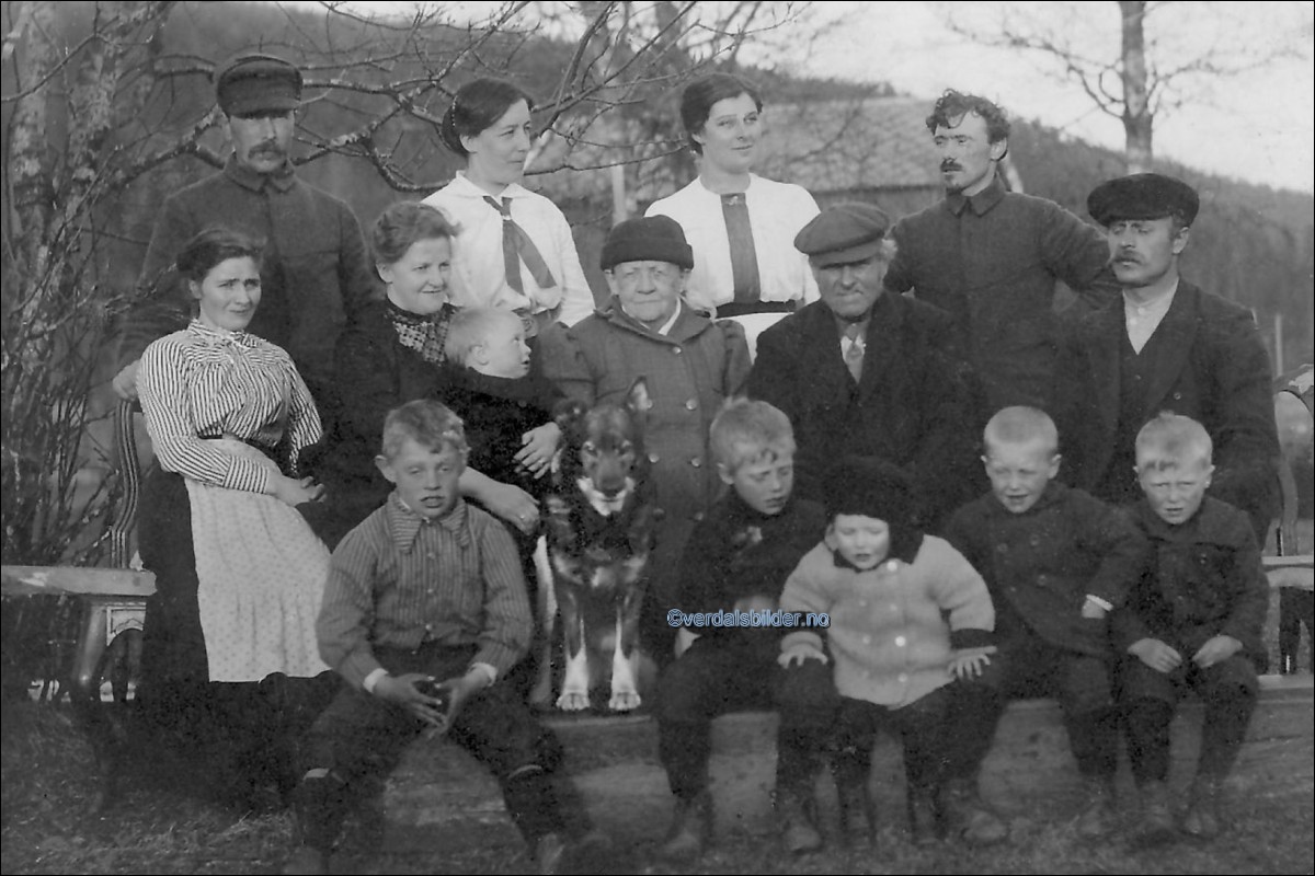 Fra Inndal Østre omkring 1915. -- Fra Inndal Østre omkring 1915. -- Utlånt av Magne Årstadvold. Navna hentet fra boka Heimer og Folk i Inndalen og Sul. Benny Andre Aasan skriver: oldefar Ole Anton Aasan øverst til venstre i bildet og oldemor Maren Aasan nederst til venstre i bildet. Deres eldste sønn Egil Aasan nr 3 fra venstre nederst i bildet????. De losjerte på den tiden på gården Inndal østre i Inndalen før de kjøpte Steinsåkeren (Steinset) i Inndalen ca i 1925 ( rett ovenfor den gamle bensinstasjonen i Steinsgropa). Dette ble deres hjem for resten av livet. Det gamle ekteparet i midten er Marens gammelonkel Nils Garnes (som opprinnelig het Indal til etternavn og var født på gården Indal Østre )med hans kone Mette. Deres datter Anna sitter i 2 rekke nr 2 fra venstre og var inngiftet på Indal Østre med husbonden Jeremias Indahl som sitter helt til høyre på andre rad ved sine svigerforeldre. Jeremias sin søster Anna Gustava Hybertsen (Indahl) nr 2 fra høyre i øverste rekke sammen med sin mann Andreas Hybertsen helt til høyre i øverste rekke. Har du korrigeringer, nye navn eller en kommentar? Ring eller send sms til 472 97 311 eller 456 00 950 Det beste er å sende en E-post til: post@verdalsbilder.no Tips noen om dette bildet : Klikk her Forstørre bildet Bruk ctrl-knapp + musehjul oppover for å forstørre bildet. Bruk ctrl-knapp + musehjul nedover for å forminske bildet Du kan også bruke "ctrl-knapp" samtidig med "+" og "-" på det numeriske tastaturet. "Ctrl" og "*" (eller null) tilbakestiller størrelsen | ||||
