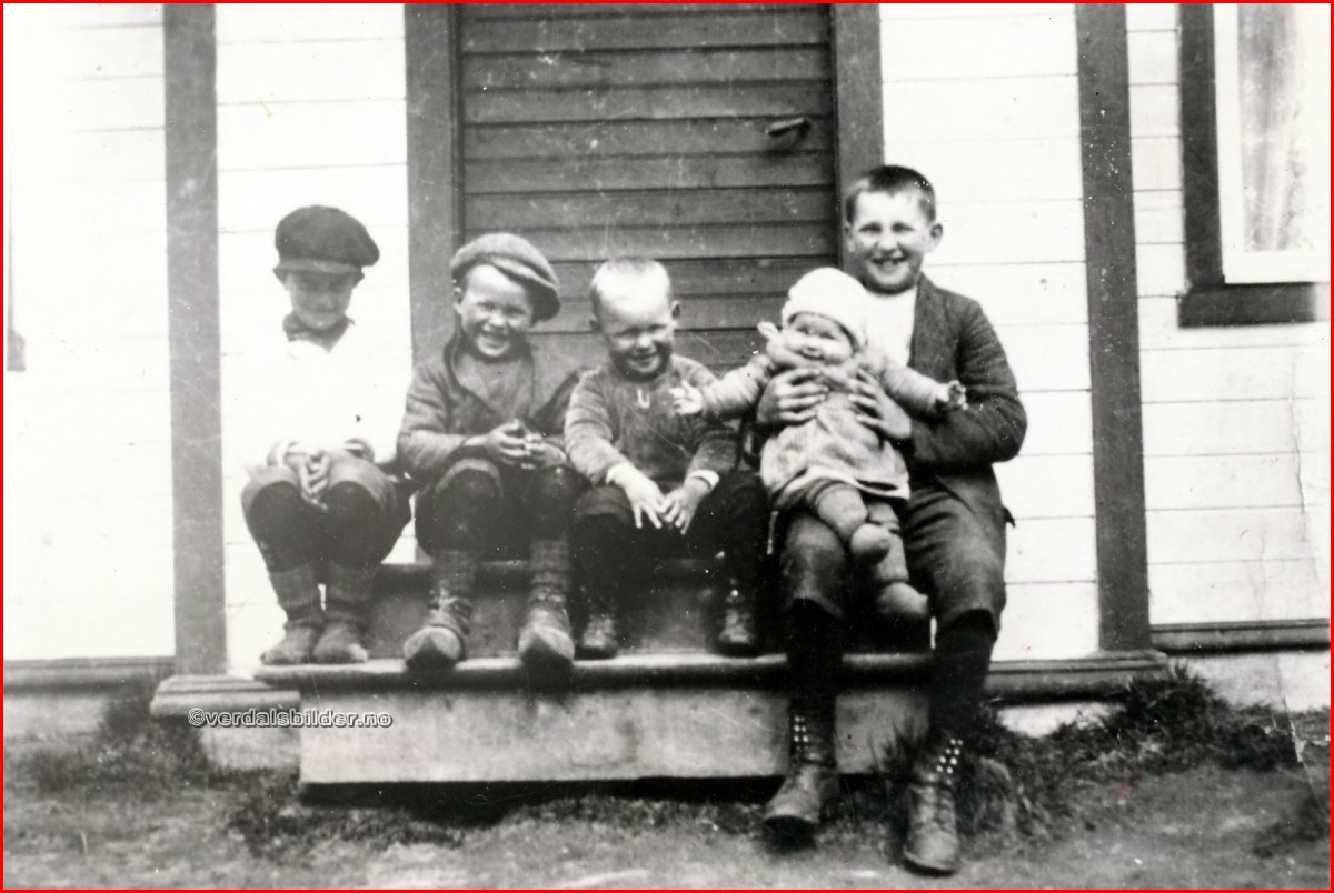 Fem storhaugsøsken samlet foran heimen på Ørmelen i 1920.     Se flere navnsatte bilder