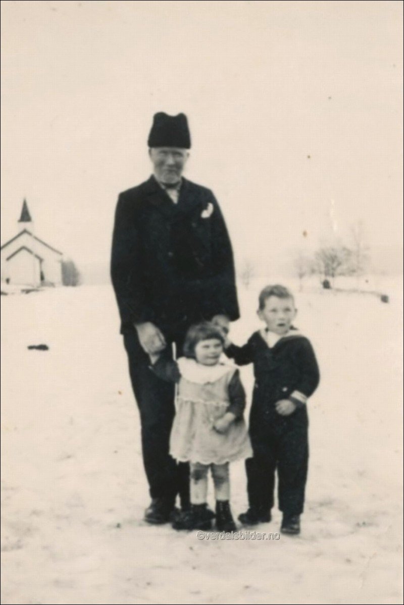 | Ei bestefarshand å holde i utenfor Vera kapell omkring år 1937. Se flere navnsatte bilder Før markør opp til haka på personene for å få opp navn |