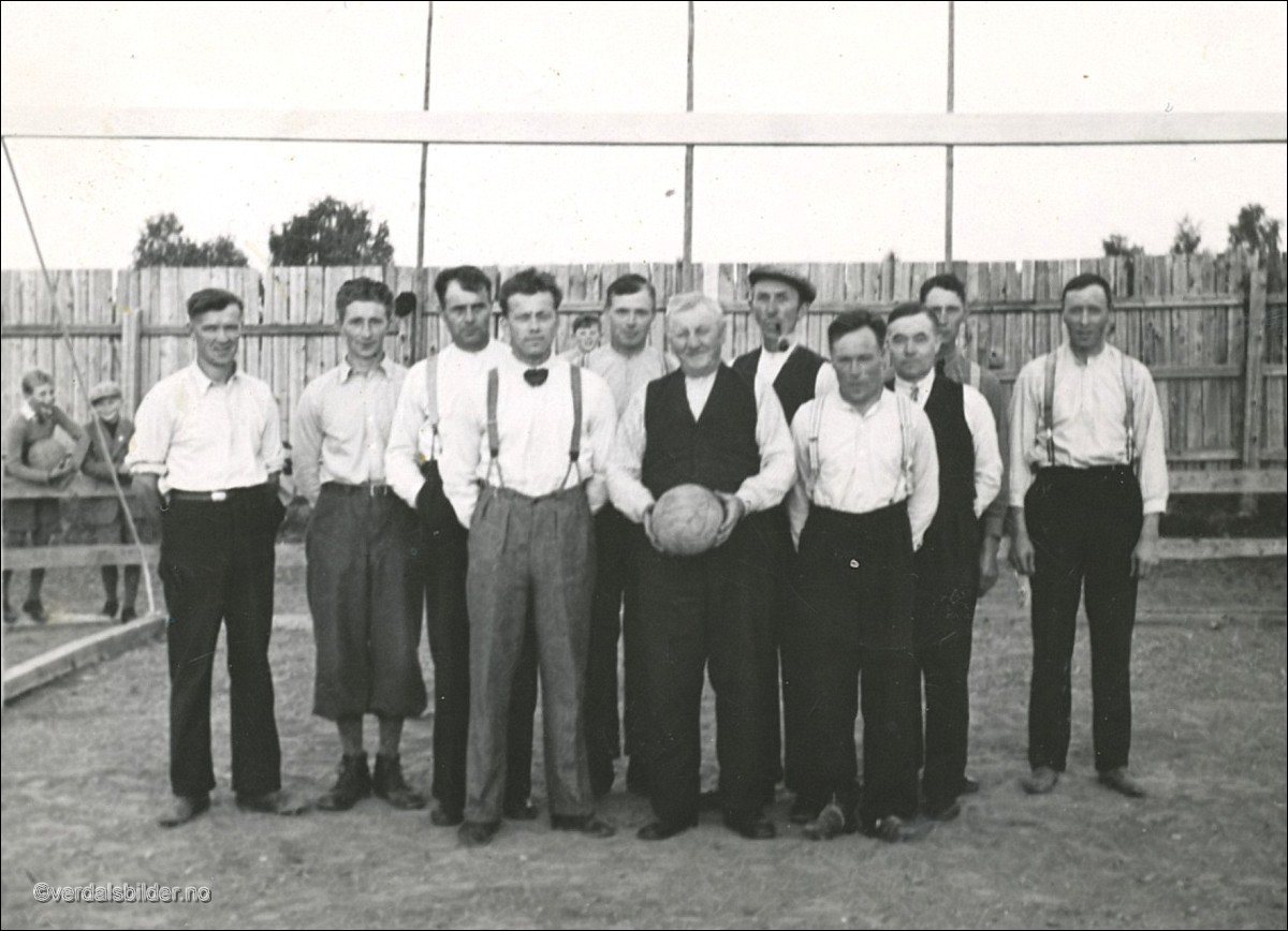 Bygdalaget som slo Øra-laget i fotball med 5 - 2 i 1938. -- Bygdalaget besto av karer fra Sjøbygda Volhaugen og Stiklestad. Det fortelles at de 5 sønnene til målmannen ble "forhindra" fra å sjå denne kampen, de skjemtes tå faren sin. Samme kilde sier også at lokalavisa valgte å ikke omtale kampen i påfølgende avis. Enkelte mente at årsaken var at feil lag vant. Inntekta av kampen gikk til inntekt for skihytta og hoppbakken Brandåsen på Volhaugen. Inngang på kampen, voksne 35 øre og barn 15 øre. Har du korrigeringer, nye navn eller en kommentar? Ring eller send sms til 472 97 311 eller 456 00 950 Det beste er å sende en E-post til: post@verdalsbilder.no Tips noen om dette bildet : Klikk her Forstørre bildet Bruk ctrl-knapp + musehjul oppover for å forstørre bildet. Bruk ctrl-knapp + musehjul nedover for å forminske bildet Du kan også bruke "ctrl-knapp" samtidig med "+" og "-" på det numeriske tastaturet. "Ctrl" og "*" (eller null) tilbakestiller størrelsen | ||||