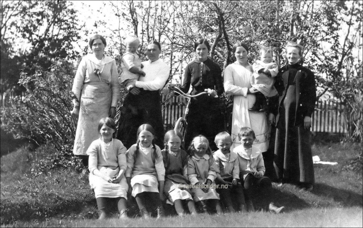 Damer og barn ved Stene rundt 1920. -- Utlånt av Ingrid Venås. Hjelp til navna fra Magnhild Stene og Mona Stene Brenne.