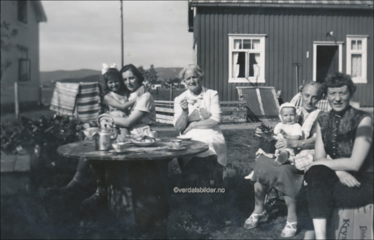 Kaffeslabberas i det fri hos Albertine Andersson på Ørmelen 1956 -- Utlånt og navnsatt av Tore Larsen. Har du korrigeringer, nye navn eller en kommentar? Ring eller send sms til 472 97 311 eller 456 00 950 Det beste er å sende en E-post til: post@verdalsbilder.no Tips noen om dette bildet : Klikk her Forstørre bildet Bruk ctrl-knapp + musehjul oppover for å forstørre bildet. Bruk ctrl-knapp + musehjul nedover for å forminske bildet Du kan også bruke "ctrl-knapp" samtidig med "+" og "-" på det numeriske tastaturet. "Ctrl" og "*" (eller null) tilbakestiller størrelsen | ||||