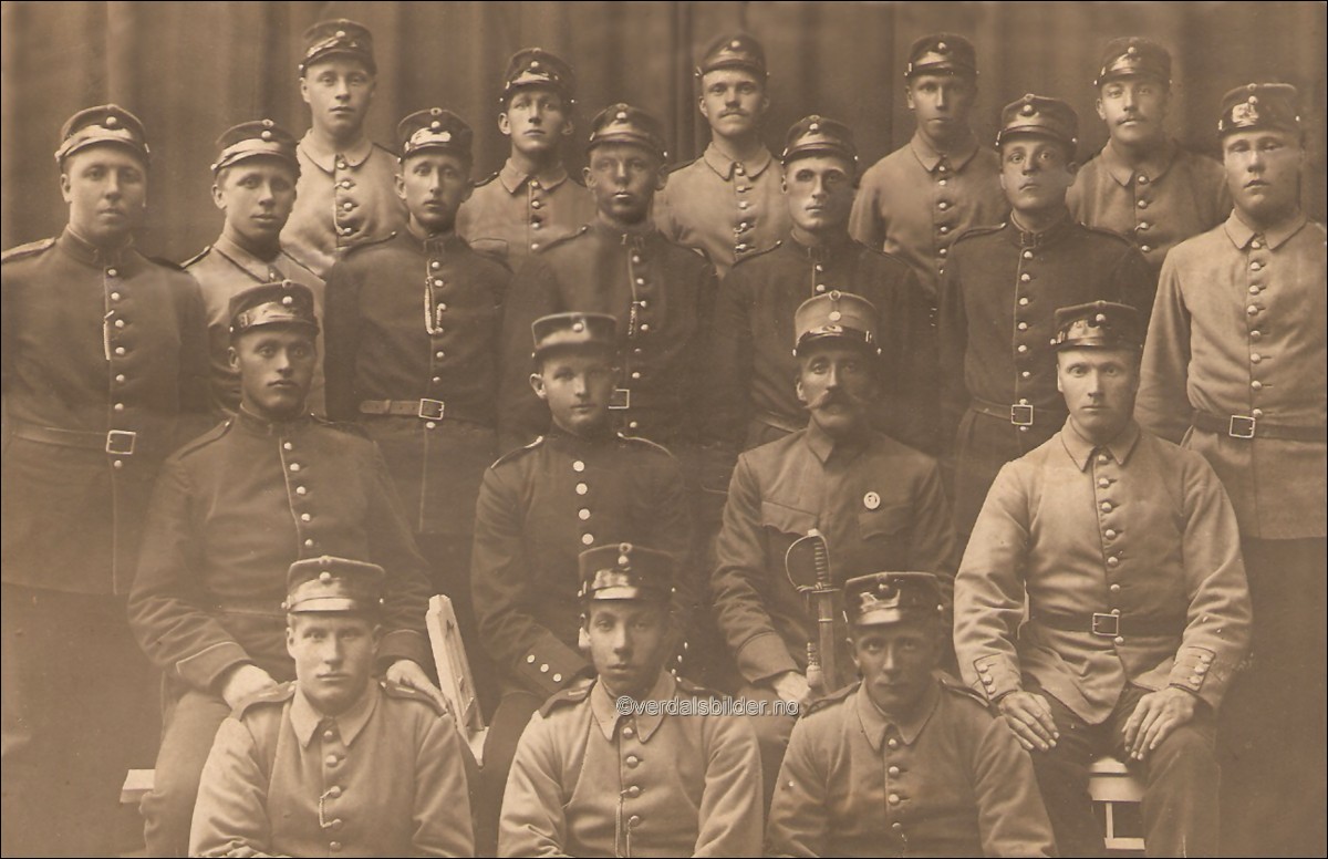 Militætjeneste omkring 1912 -- En god del ukjent på bilde. Sannsynligvis "utabøgdes". Ukjent hvor bildet er fra. Utlånt og hjelp til navna, Oddvor Haugan.