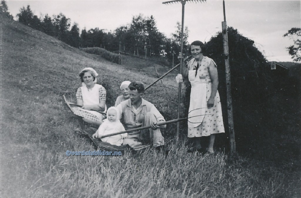 Slåttonn på Haldåsen 1938. -- På den tid hadde det ikke noe betydning om det var bratte bakker, riva og høygaffelen var redskapen. Da ble arealet ble utnyttet til fulle for å få til vinterfòr til budskapen. I dag gror det meste igjen av det som ikke er traktorjord. Utlånt av Anne Marie Slottemo.