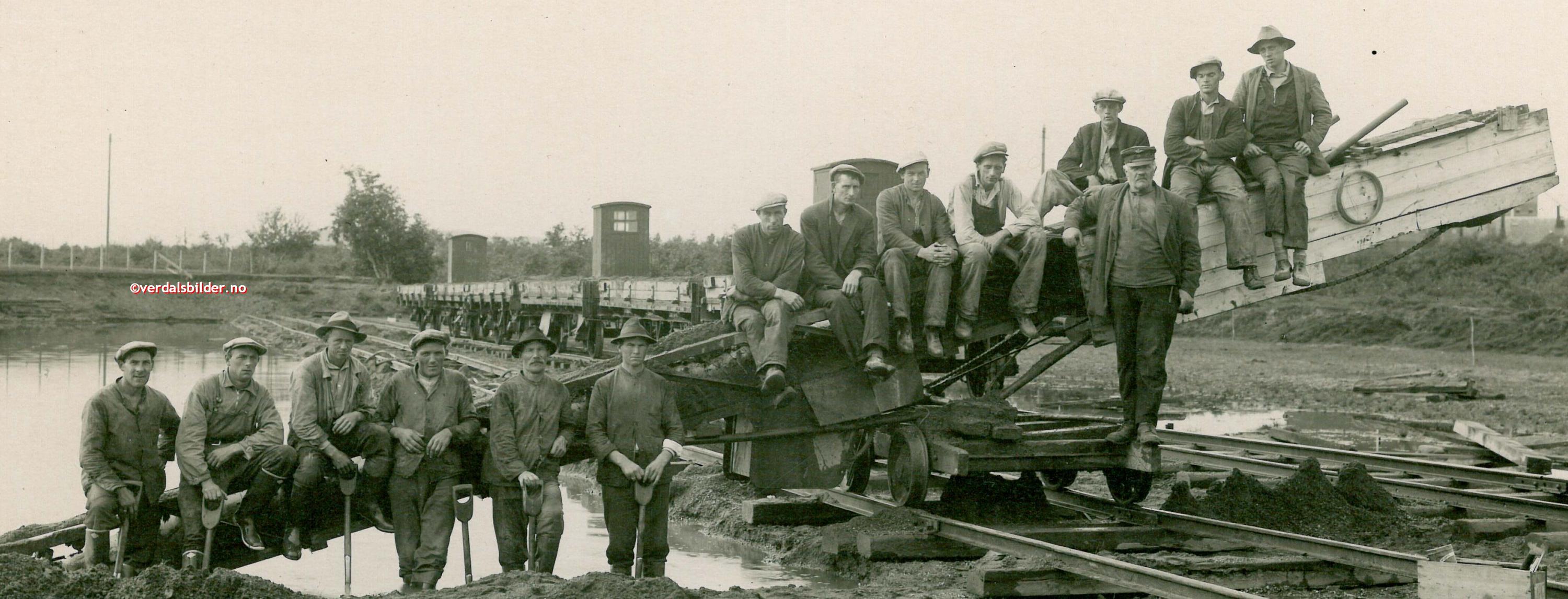 Det var lagt ut to paralelle spor. På det ytterste kom jernbanevognene som fraktet grusen videre. På det andre sporet gikk tralleinnretningen som førte transportbeltet. Mannskapet måtte ofte stå i vann og hive den tunge massen på beltet. Bildet er innsendt av Stig Arild Myhre. Navn og opplysninger er hentet fra Verdalingen. Har du korrigeringer, nye navn eller en kommentar? Ring eller send sms til 472 97 311 eller 456 00 950 Det beste er å sende en E-post til: post@verdalsbilder.no Tips noen om dette bildet : Klikk her Forstørre bildet Bruk ctrl-knapp + musehjul oppover for å forstørre bildet. Bruk ctrl-knapp + musehjul nedover for å forminske bildet Du kan også bruke "ctrl-knapp" samtidig med "+" og "-" på det numeriske tastaturet. "Ctrl" og "*" (eller null) tilbakestiller størrelsen | ||||