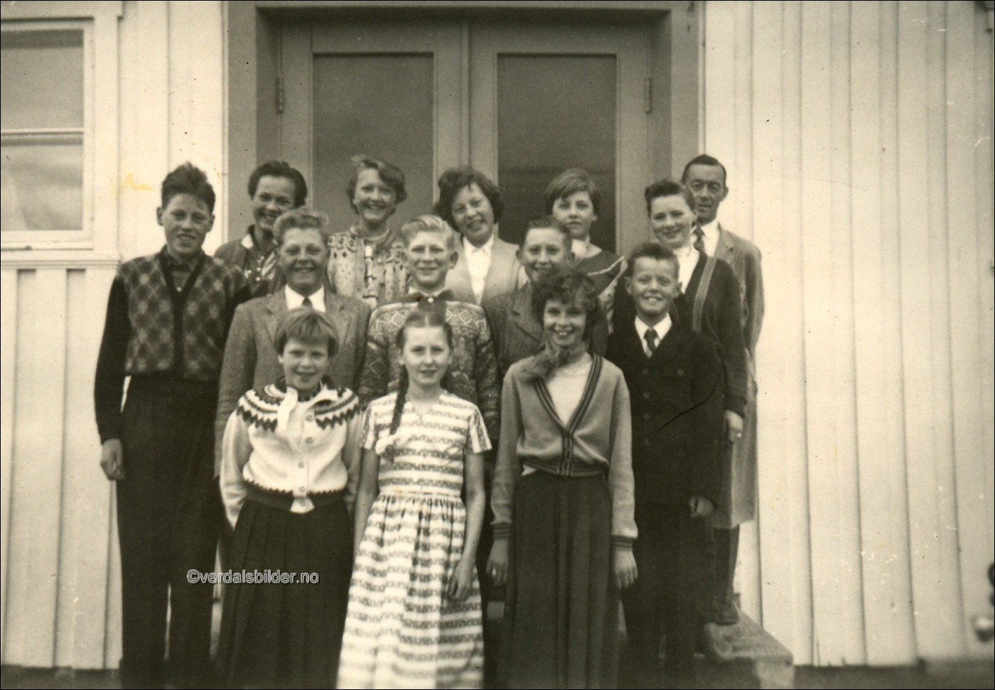 Klasse fra Leira skole omkring 1959 -- Utlånt og navnsatt av Svein Arnt Eklo. Har du korrigeringer, nye navn eller en kommentar? Ring eller send sms til 472 97 311 eller 456 00 950 Det beste er å sende en E-post til: post@verdalsbilder.no Tips noen om dette bildet : Klikk her Forstørre bildet Bruk ctrl-knapp + musehjul oppover for å forstørre bildet. Bruk ctrl-knapp + musehjul nedover for å forminske bildet Du kan også bruke "ctrl-knapp" samtidig med "+" og "-" på det numeriske tastaturet. "Ctrl" og "*" (eller null) tilbakestiller størrelsen | ||||