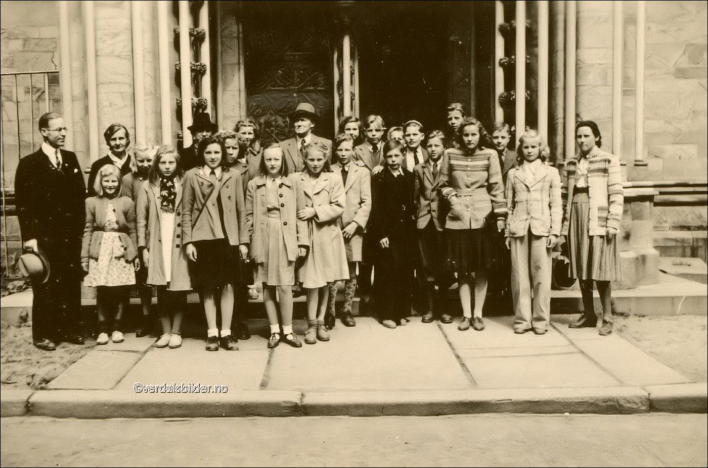Stiklestad skole på Trondheimstur omkring 1948 -- Her er 6 - 7-klasse samlet foran inngangen til Domkirken. Fotograf Anders Vandvik. Utlånt av Liv Liberg. Navnsatt av Oddbjørn Øgstad. Har du korrigeringer, nye navn eller en kommentar? Ring eller send sms til 472 97 311 eller 456 00 950 Det beste er å sende en E-post til: post@verdalsbilder.no Tips noen om dette bildet : Klikk her Forstørre bildet Bruk ctrl-knapp + musehjul oppover for å forstørre bildet. Bruk ctrl-knapp + musehjul nedover for å forminske bildet Du kan også bruke "ctrl-knapp" samtidig med "+" og "-" på det numeriske tastaturet. "Ctrl" og "*" (eller null) tilbakestiller størrelsen | ||||