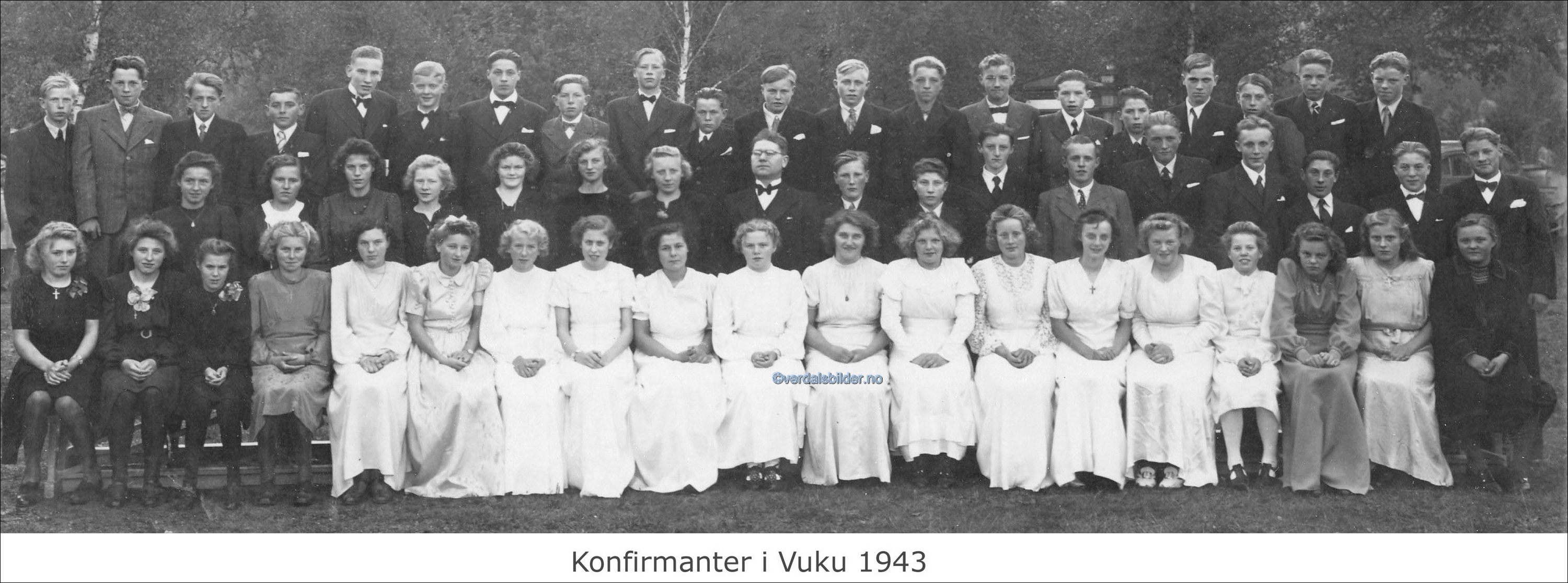 Konfirmanter i Vuku i 1943 -- Utlånt av Verdal bibliotek , navnsatt av Solveig Ness og Jørgen Johnsem m/fl. Har du korrigeringer, nye navn eller en kommentar? Ring eller send sms til 472 97 311 eller 456 00 950 Det beste er å sende en E-post til: post@verdalsbilder.no Tips noen om dette bildet : Klikk her Forstørre bildet Bruk ctrl-knapp + musehjul oppover for å forstørre bildet. Bruk ctrl-knapp + musehjul nedover for å forminske bildet Du kan også bruke "ctrl-knapp" samtidig med "+" og "-" på det numeriske tastaturet. "Ctrl" og "*" (eller null) tilbakestiller størrelsen | ||||