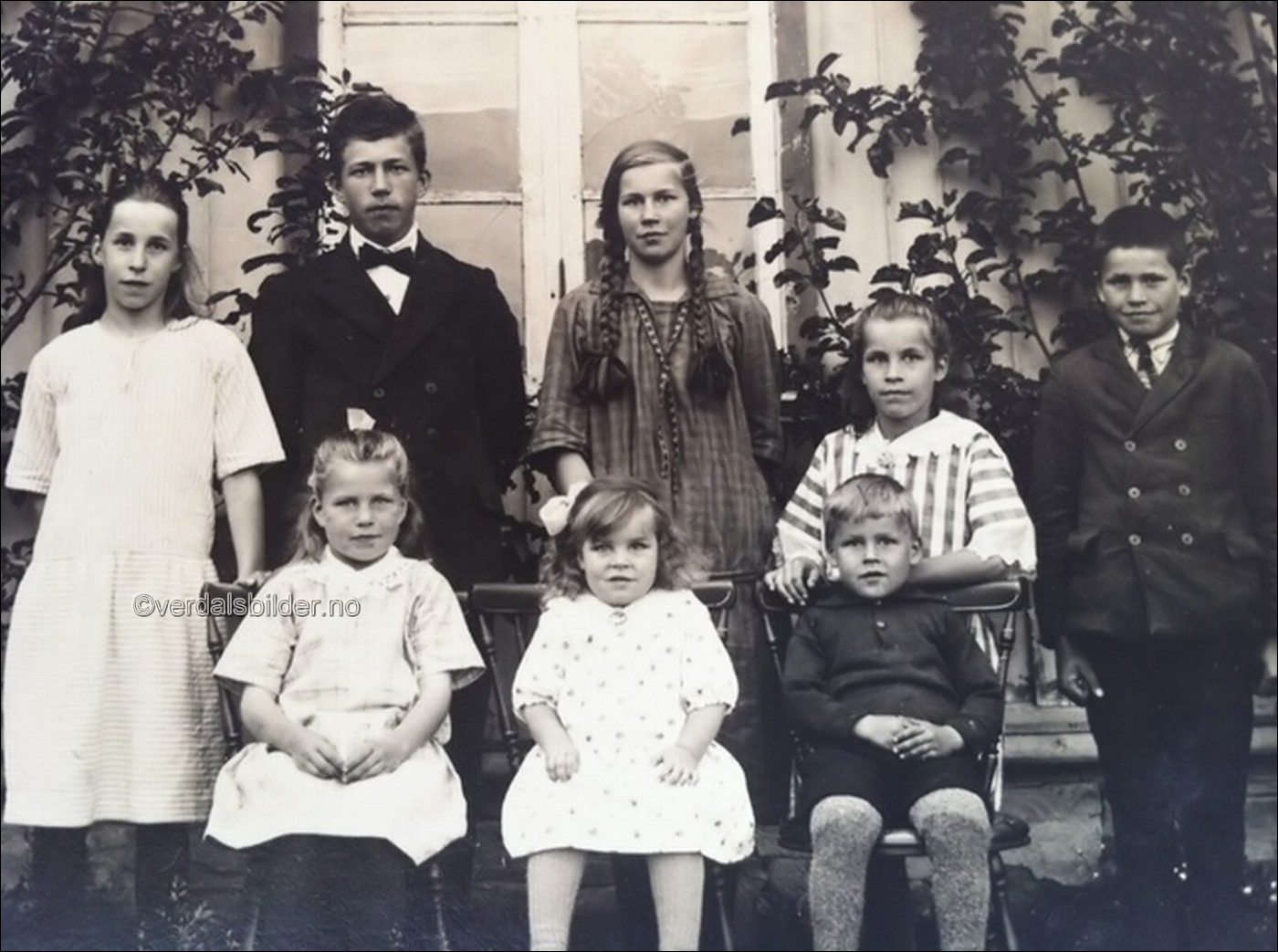 Søskenflokken Enes omkring år 1927 -- Bildet er antagelig tatt på Kolshaug.Utlånt og navnsatt av Oddfrid Kvernmo. Har du korrigeringer, nye navn eller en kommentar? Ring eller send sms til 472 97 311 eller 456 00 950 Det beste er å sende en E-post til: post@verdalsbilder.no Tips noen om dette bildet : Klikk her Forstørre bildet Bruk ctrl-knapp + musehjul oppover for å forstørre bildet. Bruk ctrl-knapp + musehjul nedover for å forminske bildet Du kan også bruke "ctrl-knapp" samtidig med "+" og "-" på det numeriske tastaturet. "Ctrl" og "*" (eller null) tilbakestiller størrelsen | ||||