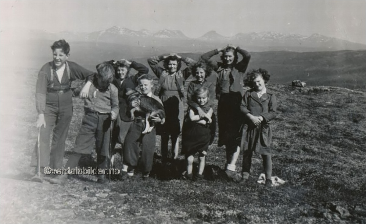 | Elever fra Kleppen skole på toppen av Vindkleppen omkring år 1946.