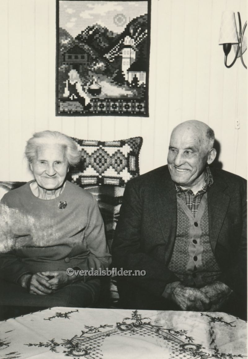 Ekteparet Kvelstad i Fagerlia nordre omkring 1975 -- Han var fra Kvelstadlia og hun fra Indalsvald. Bildet er tatt den dagen Johannes fikk tildelt Ny Jords diplom. Det fikk han for nybrottsarbeidet på Fagerlia. I tillegg til nydyrkinga bygde de opp nye hus på bruket flere ganger. Han bygde ny veg fra Setrom , ca en kilometer opp gjennom bratta uten kommunal støtte. Til bygging av nytt uthus kjørte han opp 400 hestlass med grus og det var før bilvegen kom. Han døde i 1981 og hun i 1993. Dette i flg. boka "Heimer og Folk i Inndalen og Sul" hvor en kan lese mere om Fagerlia og folket der. Har du korrigeringer, nye navn eller en kommentar? Ring eller send sms til 472 97 311 eller 456 00 950 Det beste er å sende en E-post til: post@verdalsbilder.no Tips noen om dette bildet : Klikk her Forstørre bildet Bruk ctrl-knapp + musehjul oppover for å forstørre bildet. Bruk ctrl-knapp + musehjul nedover for å forminske bildet Du kan også bruke "ctrl-knapp" samtidig med "+" og "-" på det numeriske tastaturet. "Ctrl" og "*" (eller null) tilbakestiller størrelsen | ||||