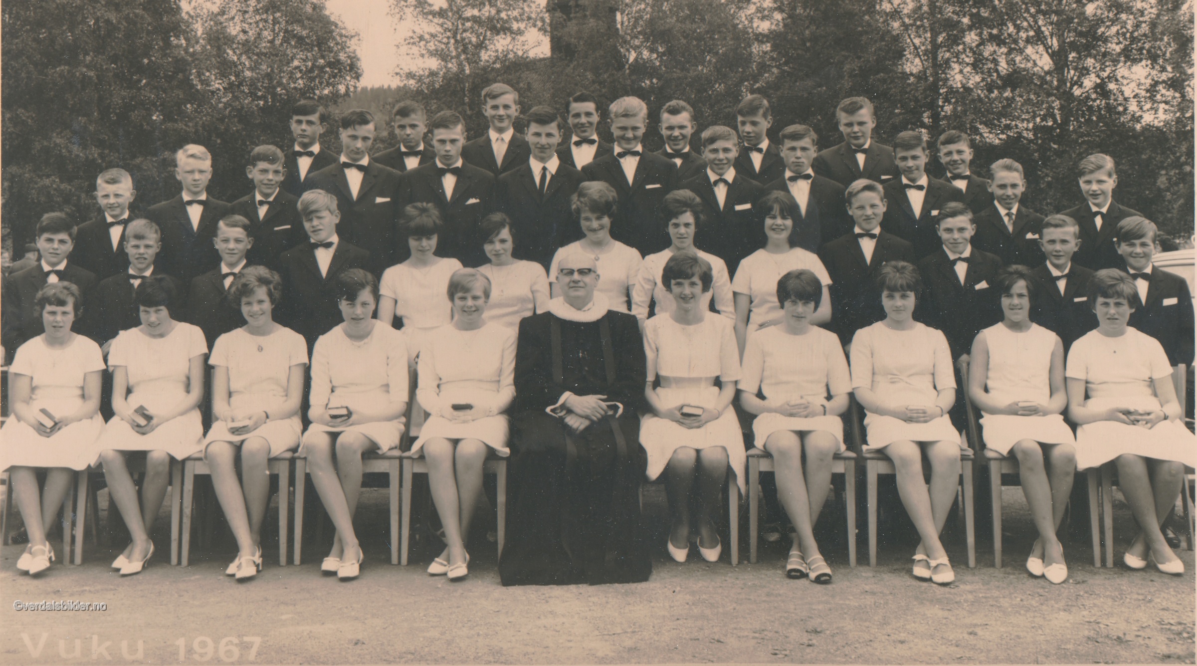 Konfirmanter i Vuku i 1967. -- Navnsettere: I hovedsak Kjetil Dillan med Gunn Indahl Granheim som "medskyldig". Utlånt av Jorid Stormo. Har du korrigeringer, nye navn eller en kommentar? Ring eller send sms til 472 97 311 eller 456 00 950 Det beste er å sende en E-post til: post@verdalsbilder.no Tips noen om dette bildet : Klikk her Forstørre bildet Bruk ctrl-knapp + musehjul oppover for å forstørre bildet. Bruk ctrl-knapp + musehjul nedover for å forminske bildet Du kan også bruke "ctrl-knapp" samtidig med "+" og "-" på det numeriske tastaturet. "Ctrl" og "*" (eller null) tilbakestiller størrelsen | ||||