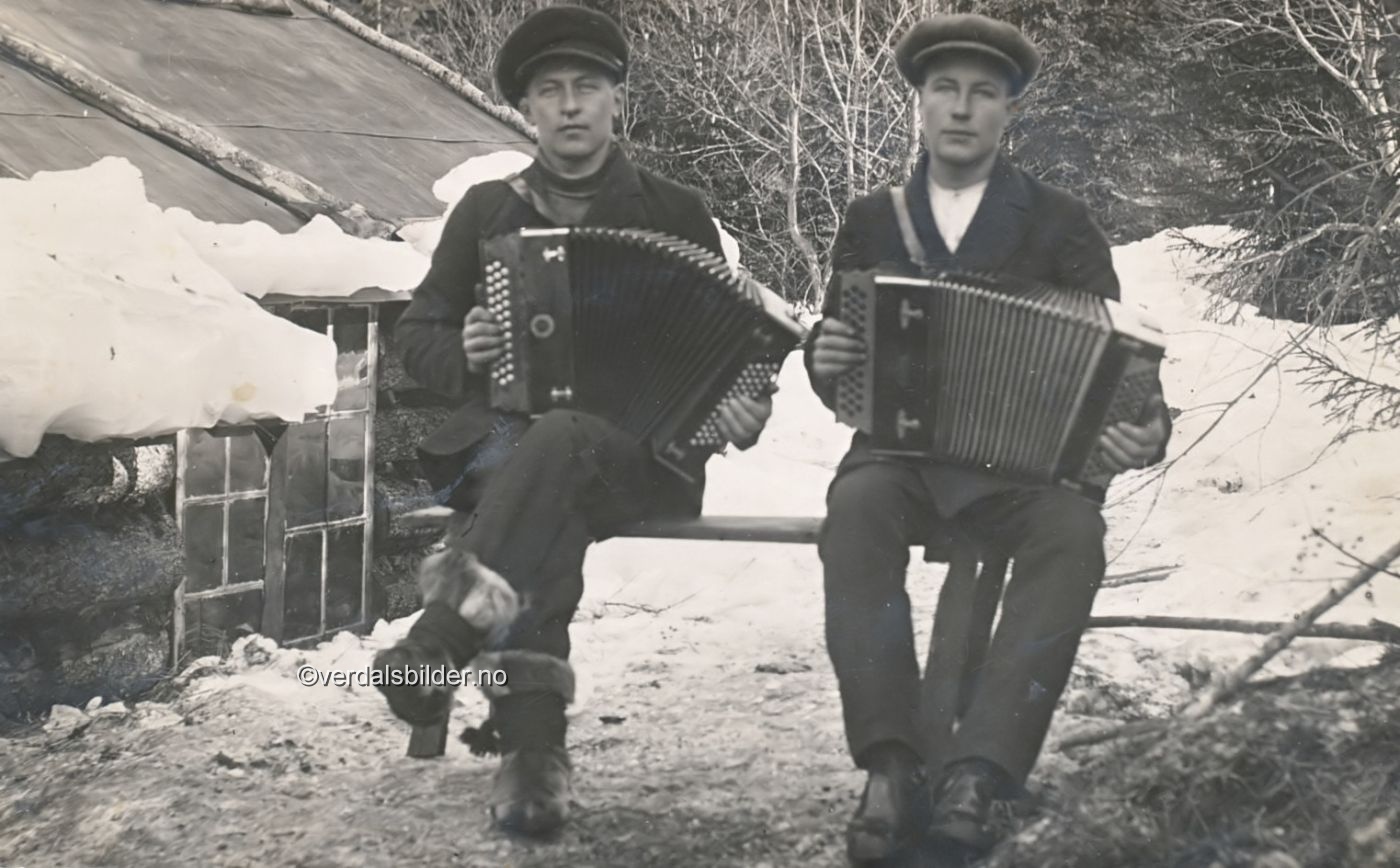 Svenske dragspelare ved Rotmokoia i Inndalen omkring år 1917. -- Utlånt av Jorunn Overholmen. Navna hentet fra Verdal Historielag`s årbok 1981. Under denne "stortida"i skogen var det mange skogsarbeidere fra Bindalen, Namdalen og svensker som invaderte Værdalsbrukets skoger og boforholdene var det vel så som så med. Med snø opp til de enkle vinduene og dårlig tak, synes denne koia ut til å være av den karrige sorten. Har du korrigeringer, nye navn eller en kommentar? Ring eller send sms til 472 97 311 eller 456 00 950 Det beste er å sende en E-post til: post@verdalsbilder.no Tips noen om dette bildet : Klikk her Forstørre bildet Bruk ctrl-knapp + musehjul oppover for å forstørre bildet. Bruk ctrl-knapp + musehjul nedover for å forminske bildet Du kan også bruke "ctrl-knapp" samtidig med "+" og "-" på det numeriske tastaturet. "Ctrl" og "*" (eller null) tilbakestiller størrelsen | ||||