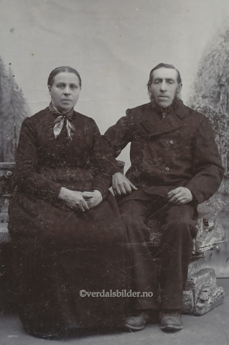 De siste plassfolket på Hestegreivald i Volhaugen omkring år 1900. -- Hestegreivald, også kalt Plassen lå på sørsiden av Ydseelva nordvest for Hestegrei nedre. Paret hadde 5 barn.Paret har brukt flere etternavn. Bak på bildet står skrevet Leiret, mens det i kirkens oversikt over døde står Huseby på han og hun Hestegreivald. Han levde i perioden 1830 (1828) - 1908 og hun 1833 - 1926. Utlånt av Aud Storhaug. Har du korrigeringer, nye navn eller en kommentar? Ring eller send sms til 472 97 311 eller 456 00 950 Det beste er å sende en E-post til: post@verdalsbilder.no Tips noen om dette bildet : Klikk her Forstørre bildet Bruk ctrl-knapp + musehjul oppover for å forstørre bildet. Bruk ctrl-knapp + musehjul nedover for å forminske bildet Du kan også bruke "ctrl-knapp" samtidig med "+" og "-" på det numeriske tastaturet. "Ctrl" og "*" (eller null) tilbakestiller størrelsen. | ||||