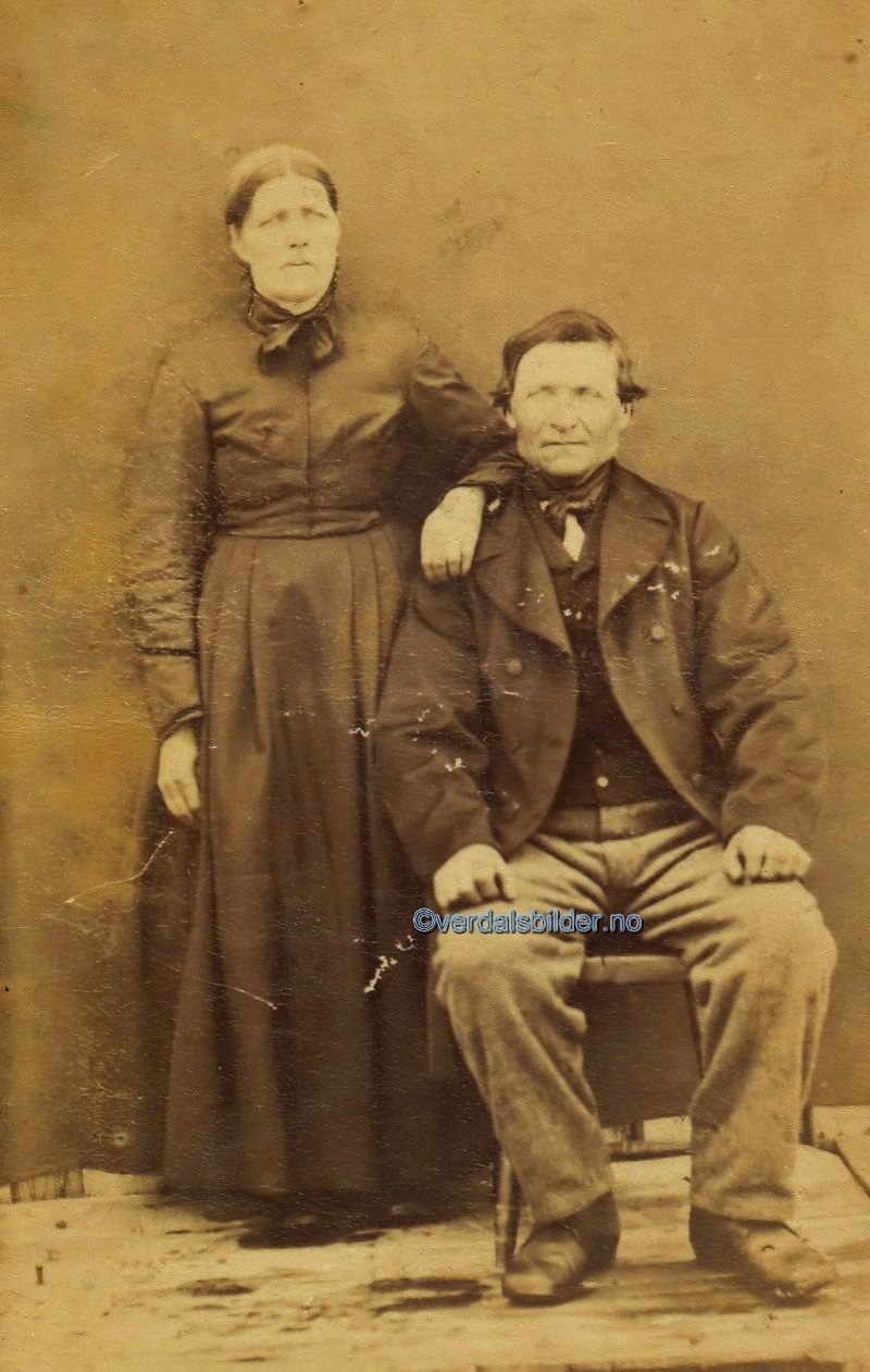 Brukere på Molden i Inndalen omkring år 1880 -- Han født i 1819, død 1900. Hun født 1821, døde på sin 44 års bryllupsdag i 1885. Jakob flyttet til Molden i 1843 og var eier fram til 1886 i flge. boka "Heimer og Folk i Inndalen og Sul". Paret hadde 8 barn hvorav den ene, Oluf, bostatte seg på Valne ved Øra. Opplysninger på baksiden av bildet. Utlånt av Aud Storhaug. Har du korrigeringer, nye navn eller en kommentar? Ring eller send sms til 472 97 311 eller 456 00 950 Det beste er å sende en E-post til: post@verdalsbilder.no Tips noen om dette bildet : Klikk her Forstørre bildet Bruk ctrl-knapp + musehjul oppover for å forstørre bildet. Bruk ctrl-knapp + musehjul nedover for å forminske bildet Du kan også bruke "ctrl-knapp" samtidig med "+" og "-" på det numeriske tastaturet. "Ctrl" og "*" (eller null) tilbakestiller størrelsen. | ||||
