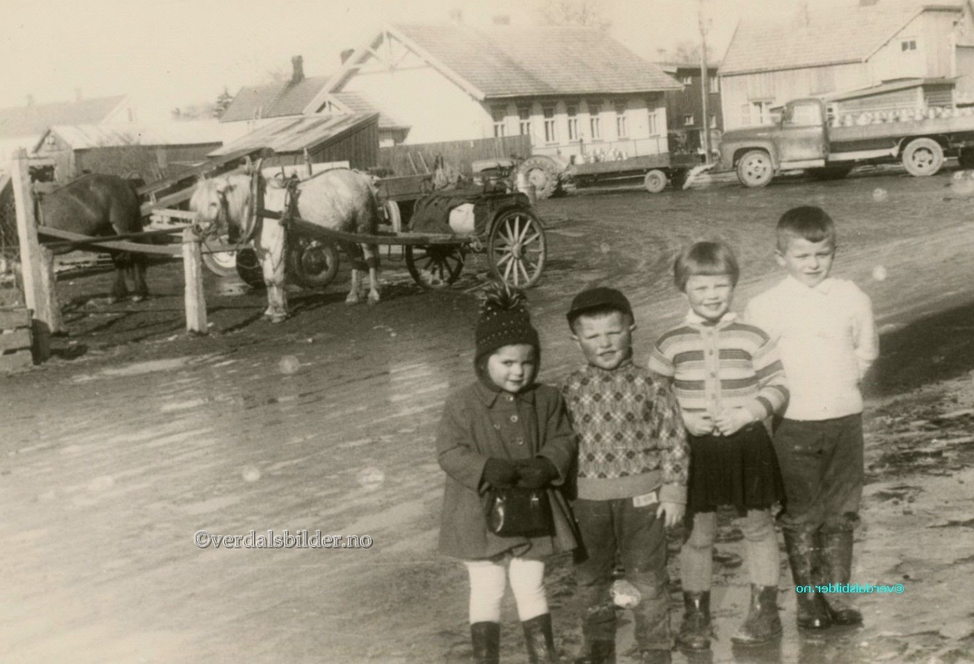 På Minsaas plass rundt 1956 -- Bildet er interessant ut fra overgangen fra hest til motorisert som framkomstmiddel til Øra. En gråtass med melkespann på hengeren i bakgrunnen foran en melkebil som var vanlig på den tid. Lemping av spann sammen med sjåføren gikk på omgang blandt gårdbrukerene som soknet til melkeruta. Utlånt av Jorunn Overholmen. Har du korrigeringer, nye navn eller en kommentar? Ring eller send sms til 472 97 311 eller 456 00 950 Det beste er å sende en E-post til: post@verdalsbilder.no Tips noen om dette bildet : Klikk her Forstørre bildet Bruk ctrl-knapp + musehjul oppover for å forstørre bildet. Bruk ctrl-knapp + musehjul nedover for å forminske bildet Du kan også bruke "ctrl-knapp" samtidig med "+" og "-" på det numeriske tastaturet. "Ctrl" og "*" (eller null) tilbakestiller størrelsen | ||||