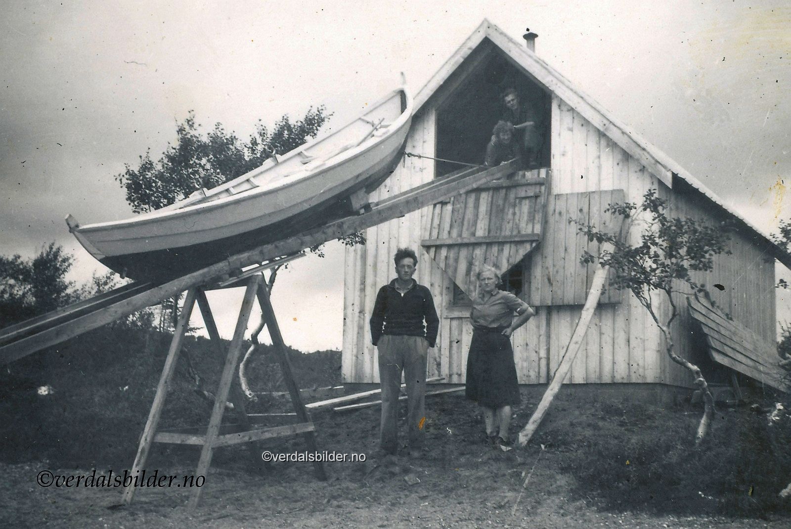 Båt til vinteropplag omkring år 1938 -- Det kan synes å være en tungvint måte å sikre båten på. Nesten 100% sikkert ved Grønningen, nærmere bestemt Røstadhytta ved Jensåsbekken. Foto av Sturla Rindsem. Utlånt av Aud Storhaug. Har du korrigeringer, nye navn eller en kommentar? Ring eller send sms til 472 97 311 eller 456 00 950 Det beste er å sende en E-post til: post@verdalsbilder.no Tips noen om dette bildet : Klikk her Forstørre bildet Bruk ctrl-knapp + musehjul oppover for å forstørre bildet. Bruk ctrl-knapp + musehjul nedover for å forminske bildet Du kan også bruke "ctrl-knapp" samtidig med "+" og "-" på det numeriske tastaturet. "Ctrl" og "*" (eller null) tilbakestiller størrelsen | ||||