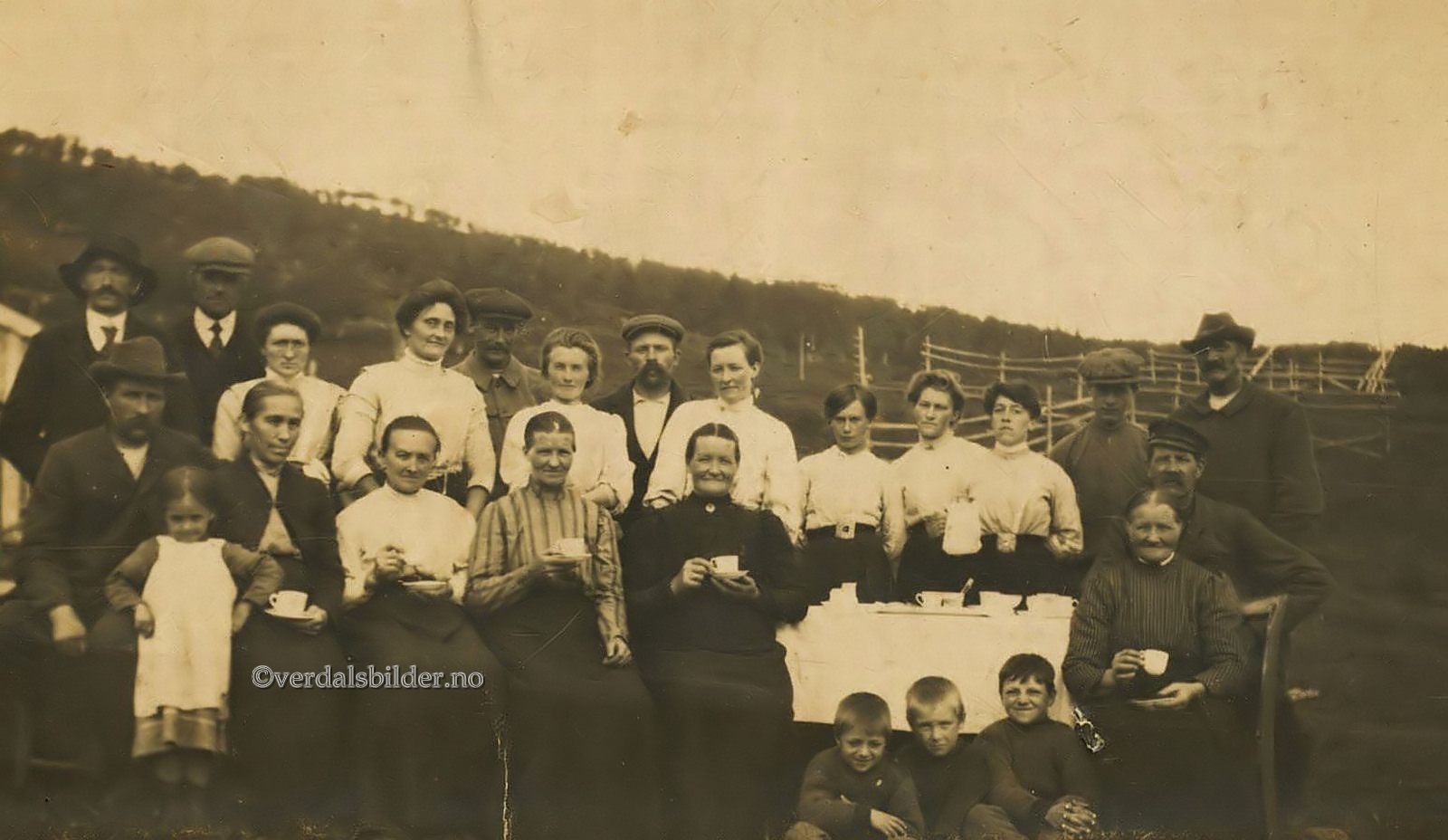Sammenkomst på Renssjøen omkring 1914 -- Utlånt av Birger Sisselvold. Navnsatt av samme person og noen navn hentet fra Helgådalens Bildearkiv. Linnea Jönsson
