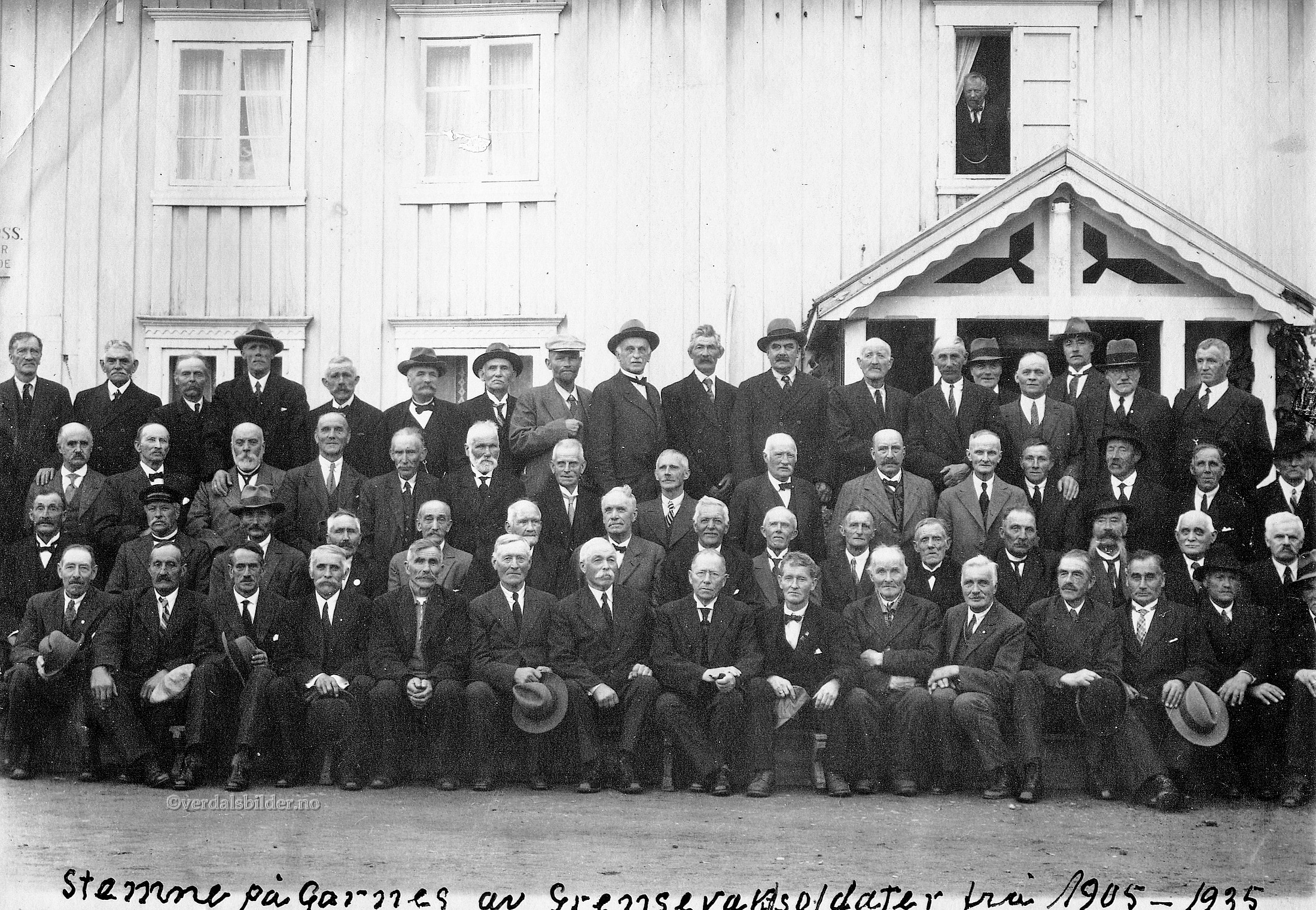 Grensevaktsoldater samlet i 1935. -- Stemne på Garnes i Inndalen. Mange ukjente her. Hjelp med navn, Magne Årstadvold. Utlånt av Dagfinn Dahl.