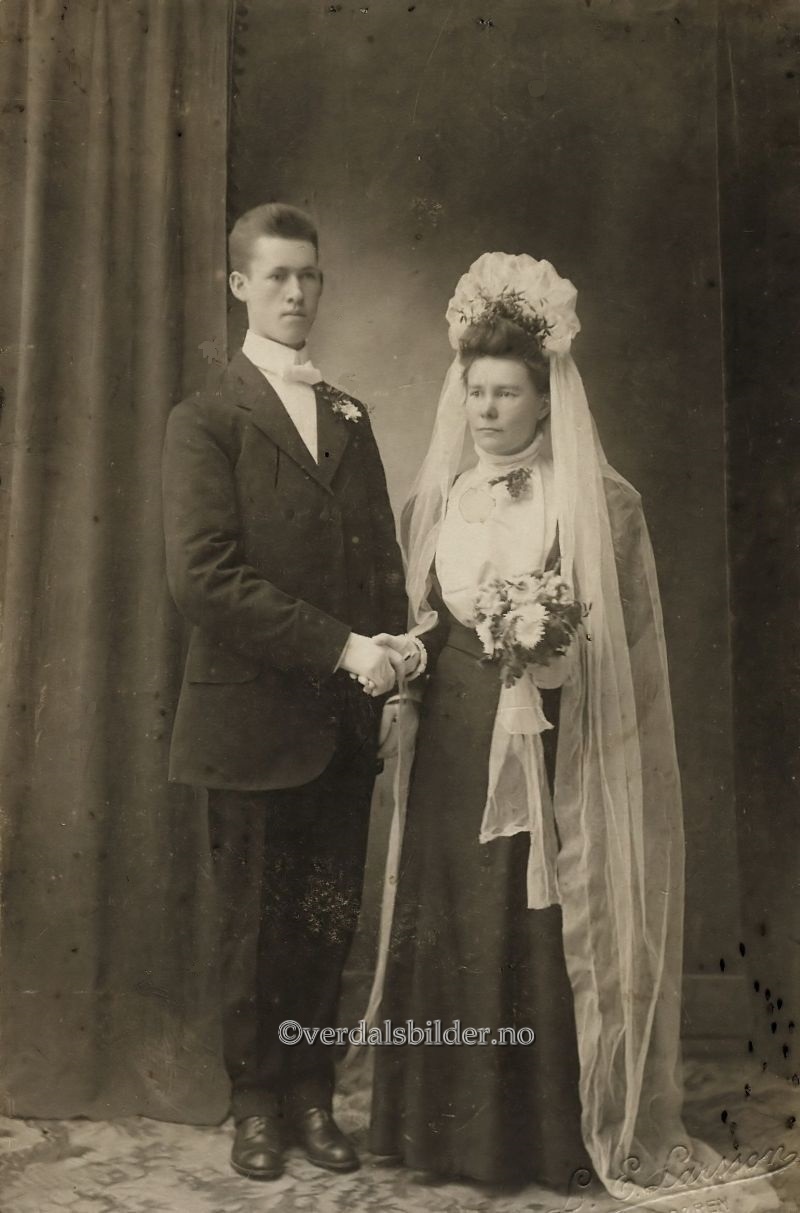Brudeparet Gran og Grongstad omkring år 1920 -- Brudgommen ble reddet fra Verdalsraset i år 1893 som ettåring mens to av hans søsken omkom. Han var fra Aksnes Søndre (Bakkan) i Leksdalen. Hun fra Høylandet. Parets som bodde på Namsos hadden ingen barn. Utlånt av Albert Martin Tiller. Har du korrigeringer, nye navn eller en kommentar? Ring eller send sms til 472 97 311 eller 456 00 950 Det beste er å sende en E-post til: post@verdalsbilder.no Tips noen om dette bildet : Klikk her Forstørre bildet Bruk ctrl-knapp + musehjul oppover for å forstørre bildet. Bruk ctrl-knapp + musehjul nedover for å forminske bildet Du kan også bruke "ctrl-knapp" samtidig med "+" og "-" på det numeriske tastaturet. "Ctrl" og "*" (eller null) tilbakestiller størrelsen. | ||||