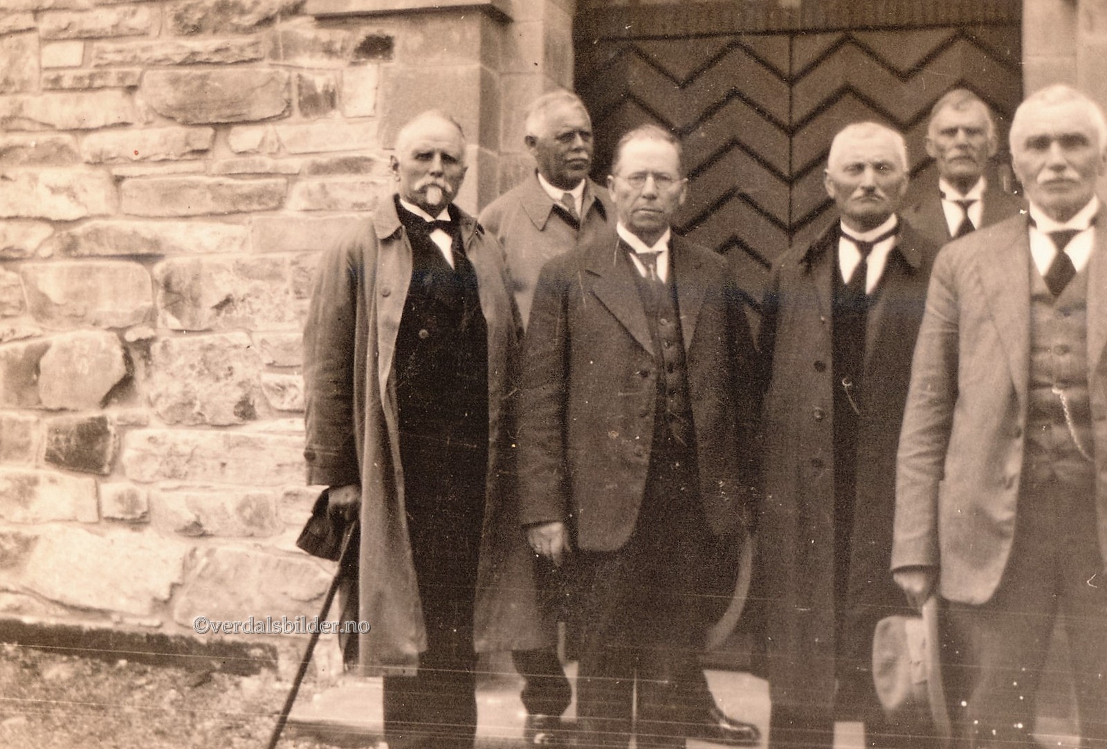 | Eldre menn foran restaurert Stiklestad Kirke omkring år 1935