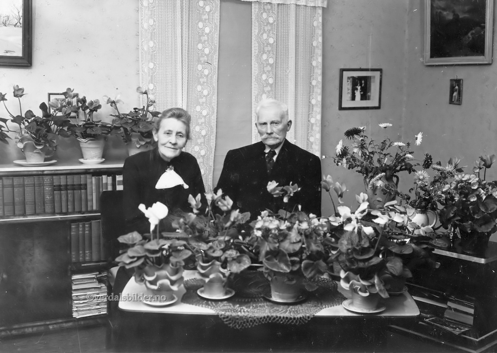 Ekteparet Tiller trolig omkring år 1955 -- Bildet er trolig fra gullbryllupsdagen i 1955. Paret hadde 5 barn. Etter flere år som maler på Levanger flyttet Tiller tilbake til heimkommunen og etablerte Verdalens første malerfirma. Malerverkstedet på Garpa ble oppsatt i 1920-åra. Sønnen Magnus overtok firmaet etter Martin. Utlånt av Albert Martin Tiller. Opplysninger fra boka om Heimer og Folk på Øra. Har du korrigeringer, nye navn eller en kommentar? Ring eller send sms til 472 97 311 eller 456 00 950 Det beste er å sende en E-post til: post@verdalsbilder.no Tips noen om dette bildet : Klikk her Forstørre bildet Bruk ctrl-knapp + musehjul oppover for å forstørre bildet. Bruk ctrl-knapp + musehjul nedover for å forminske bildet Du kan også bruke "ctrl-knapp" samtidig med "+" og "-" på det numeriske tastaturet. "Ctrl" og "*" (eller null) tilbakestiller størrelsen | ||||