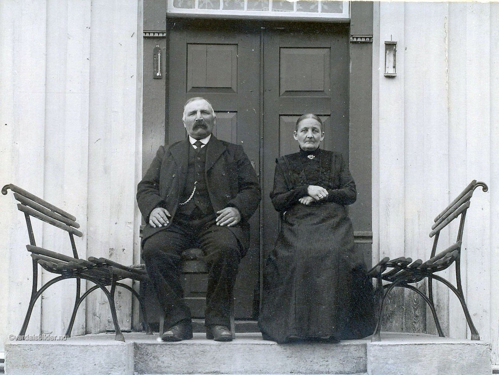 Ekteparet Gudding på trappa i Vohlen Vestre omkring år 1916 -- Utlånt med navn av Halvor Stornes. Har du korrigeringer, nye navn eller en kommentar? Ring eller send sms til 472 97 311 eller 456 00 950 Det beste er å sende en E-post til: post@verdalsbilder.no Tips noen om dette bildet : Klikk her Forstørre bildet Bruk ctrl-knapp + musehjul oppover for å forstørre bildet. Bruk ctrl-knapp + musehjul nedover for å forminske bildet Du kan også bruke "ctrl-knapp" samtidig med "+" og "-" på det numeriske tastaturet. "Ctrl" og "*" (eller null) tilbakestiller størrelsen | ||||